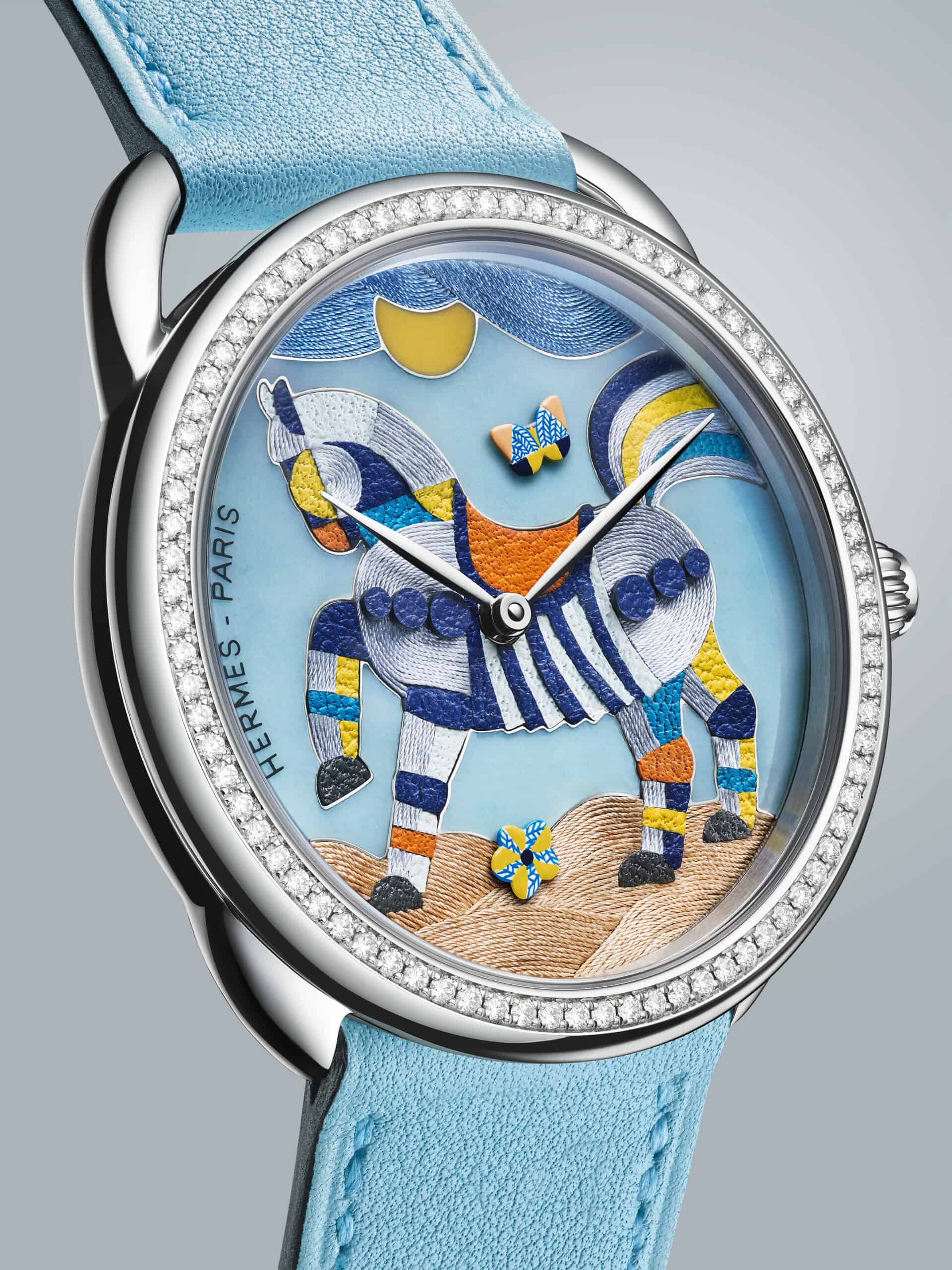 Read moreThe stunning Hermès Arceau Mon Premier Galop interweaves silk threads with colourful leather fragments on an enamel background. Enhanced with leather marquetry, silk