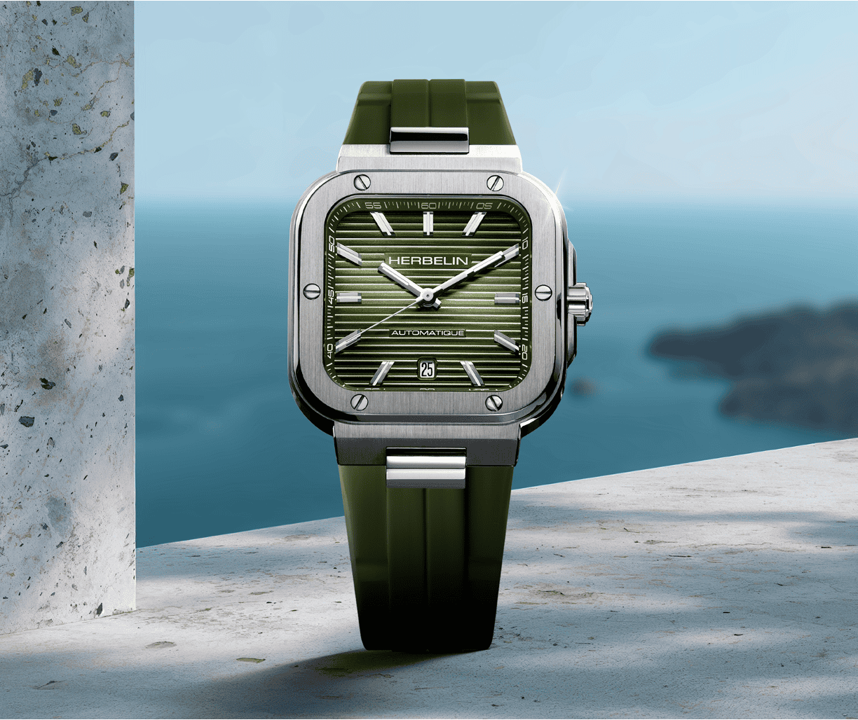 Read moreHerbelin’s Cap Camarat Square Automatic makes a striking impression with its distinctive khaki dial and matching FKM rubber strap. Evoking both military precision