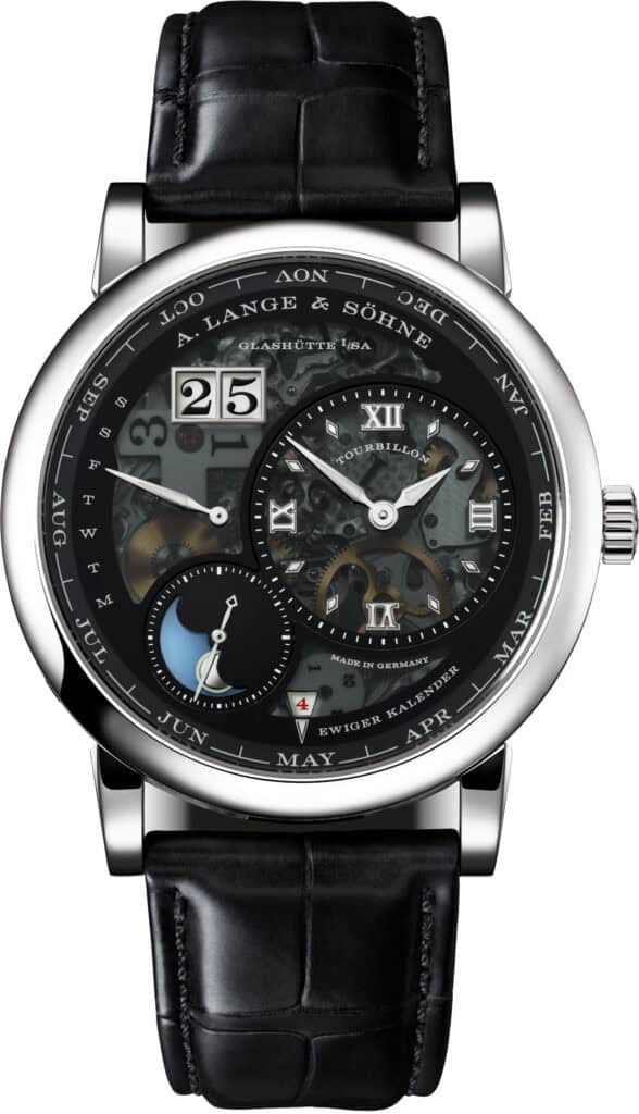 Housed in a 41.9mm platinum case and paired with a black alligator leather strap, the LANGE 1 TOURBILLON PERPETUAL CALENDAR ‘Lumen’ exudes understated luxury.