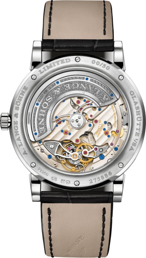 The tourbillon, visible only from the reverse, rotates once per minute, counteracting the effects of gravity to enhance precision. Thanks to Lange’s patented stop-seconds mechanism, it can even be set with exacting one-second accuracy.