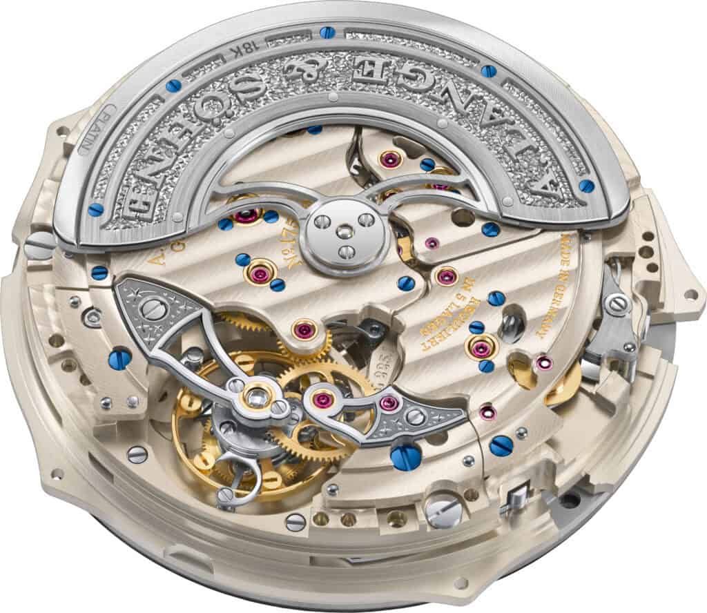 Comprising 685 components, the movement showcases the very best of traditional Saxon watchmaking: hand-engraved elements, black-polished steel parts, and a rich tapestry of decorative finishes including perlage, solarisation and circular graining.