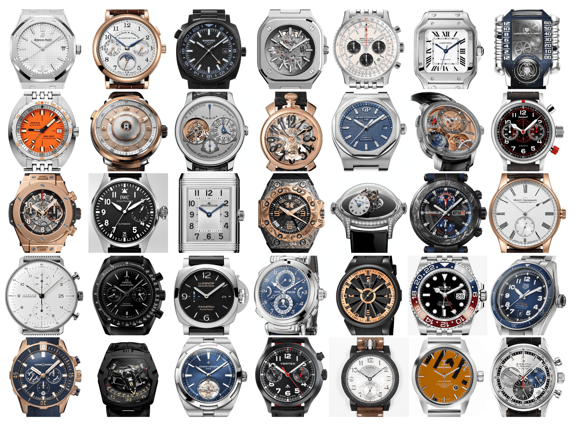 Brands # 96Zero A A. Lange & Söhne Alexander Shorokhoff Andersen Genève André Clémençon Armin Strom Arnold & Son ATOWAK Audemars Piguet B Backes & Strauss Ball Watch Bamford London Baume & Mercier Bell & Ross Benjamin James Blackout Watches BOLDR BOMBERG BOTTA Breguet Breitling BRELLUM Bremont Bvlgari C Carl F. Bucherer Cartier Chanel Christophe Claret Christopher Ward Chopard Chronoswiss CITIZEN Corum CuleM CYRUS Czapek D DONE Watches DOXA E Edward Christopher Elliot Brown Ématelier ESCUDO Exaequo F F. P. Journe Fabergé Fears Ferdinand Berthoud FORMEX Franck Dubarry G G-SHOCK Gagà Laboratorio Gagà Milano Girard-Perregaux Grand Seiko H H. Moser & Cie Hanhart HERBELIN Hermès Hublot I Isotope Watches IWC Schaffhausen J Jacob & Co. Jaeger-LeCoultre Junghans L Leica Linde Werdelin Louis Erard Louis Moinet M Maison Boanton Marloe Watch Company Maurice Lacroix MB&F MeisterSinger MICROMILSPEC Minase Montblanc Moritz Grossmann Mr Jones Watches Mühle-Glashütte N Nezumi NixieFab France NOMOS NORQAIN O OCEANEVA Ollech & Wajs Omega ORIS P Panerai Patek Philippe Piaget Poljot-International Praesidus Watches R Rado Raketa Rebellion Timepieces Reservoir Ressence Richard Mille Romain Gauthier Roger Dubuis Roger W. Smith Rolex S Schwarz Etienne SDC Watches Sherpa Watches Sherwood Watches Sortie Watches Speake-Marin T TAG Heuer Timeless Watches TITONI traser Trilobe Tudor Tusenö U U-BOAT Ulysse Nardin URWERK V Vacheron Constantin Van Brauge Vario Vertex Vortic Watch Company W Werenbach William Wood London Y YEMA Z Zenith