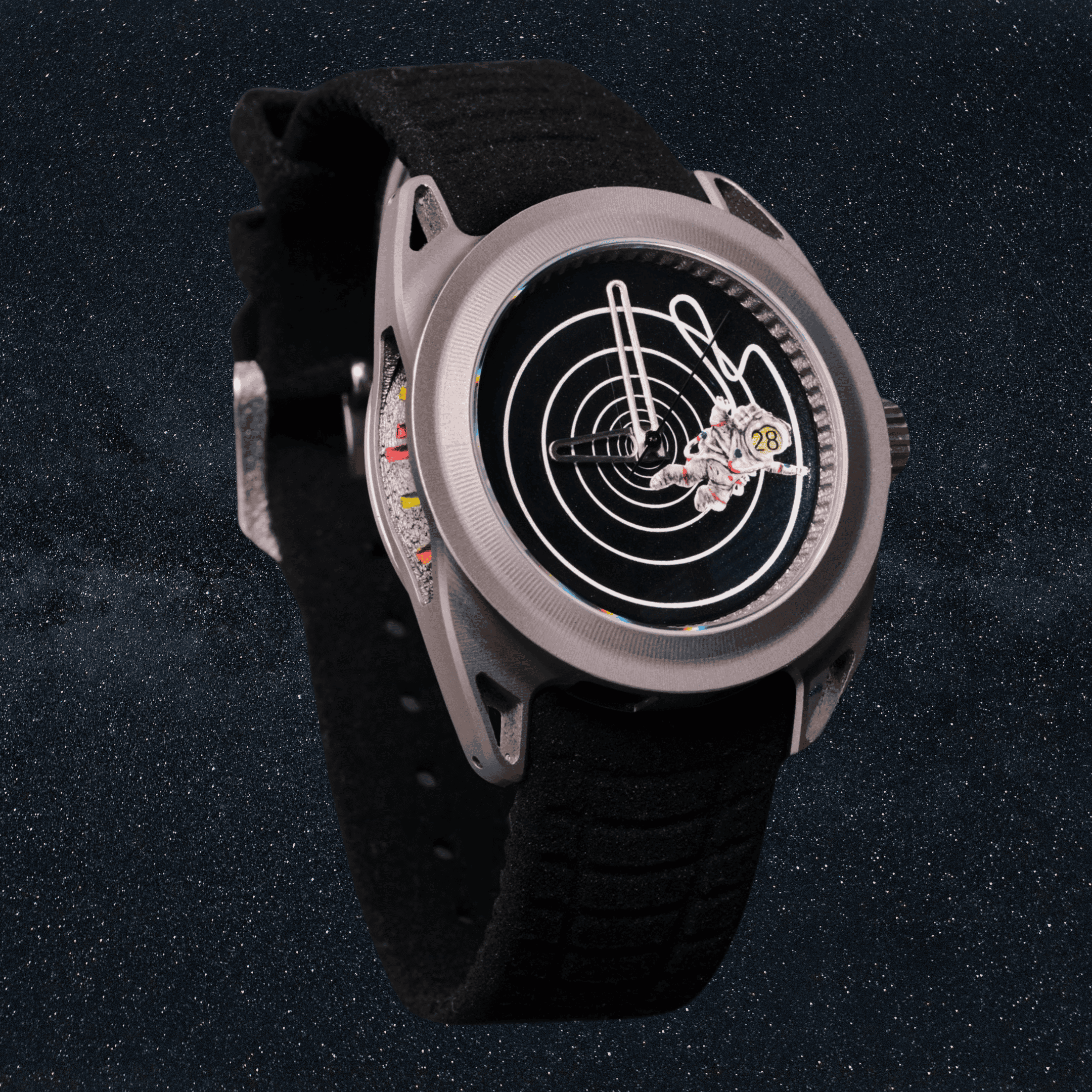 The dial is where the journey begins, with the hand-painted astronaut figure floating, tethered to the concave, galaxy-inspired centre as they are pulled toward the heart of the wormhole. The lumed tether glows, symbolising their passage deeper into the mysteries of space. Surrounding this, the case’s hollow, latticed internal structure is curved like a scientific diagram of a wormhole, with light bending through its twisting paths. To capture this cosmic energy, slits within the lattice are filled with multi-coloured enamel paint, representing beams of light bending and stretching through the curvature of space-time.