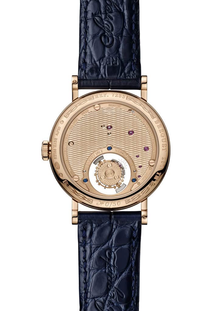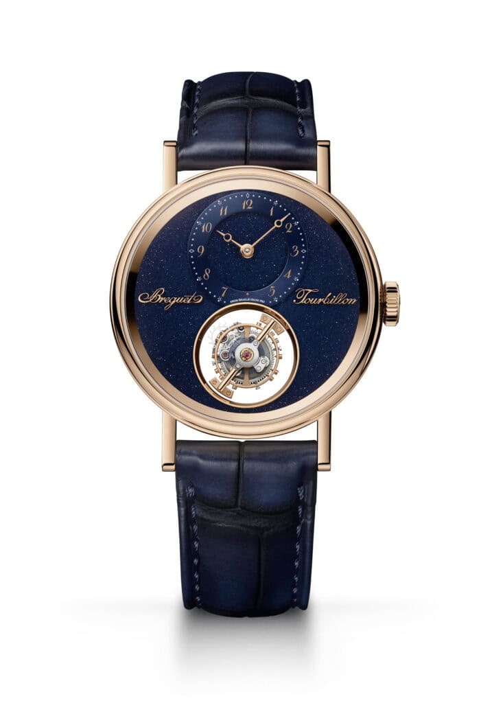 Classique Tourbillon Sidéral 7255, hand-wound Calibre 187M1, 2.5 Hz and 50-hour power reserve, Quai de l’Horloge guilloché on the caseback, 38 mm-diameter case, fluted middle, aventurine enamel grand feu dial, Breguet Arabic numerals, Breguet 18K gold hollowed-head hour and minute hands, Breguet gold “Breguet” and “Tourbillon” applied elements, alligator strap and 18K Breguet gold folding clasp, limited edition of 50 units.