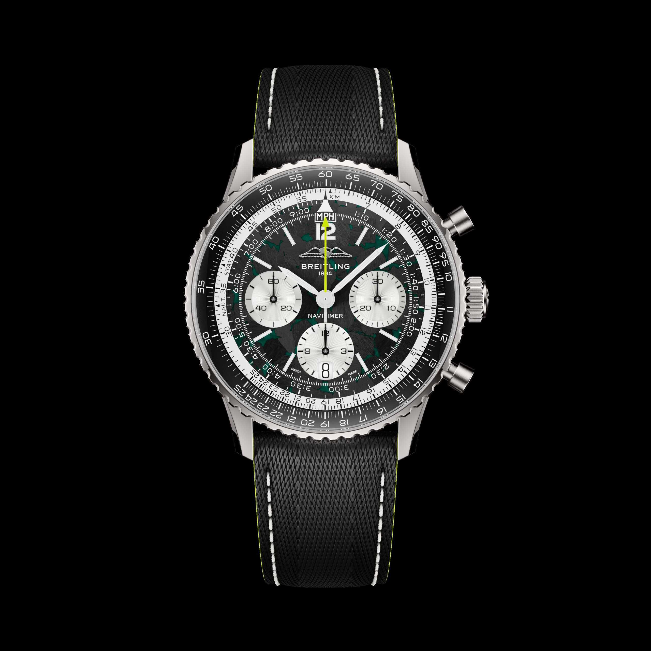 The Navitimer B01 Chronograph 43 Aston Martin Aramco Formula One™ Team is unlike any Navitimer before it. For the first time, the model is housed in titanium, reducing weight while increasing wearability—an unmistakable motorsport influence. The carbon-fibr edial, lifted straight from the language of the F1® cockpit, is paired with Aston Martin Racing Green and lime accents drawn from the current livery. The leather strap, textured to recall a racing harness, completes the connection.
