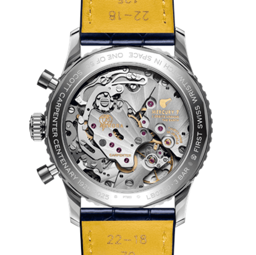 The caseback is engraved with special tributes: “Carpenter,” his capsule “Aurora 7,” “3 orbits around the Earth,” and “Mercury 7,” NASA’s first astronaut group. Additional engravings include “First Swiss wristwatch in space,” “One of 50,” and “Scott Carpenter Centenary 1925–2025.”