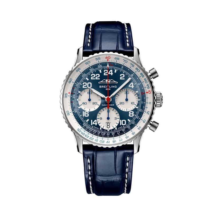 At 12 o’clock, the dial features the winged logo of the Aircraft Owners and Pilots Association (AOPA), reflecting the Navitimer’s roots as the official watch for the world’s largest pilots’ club since 1952. The dial includes three subdials for running seconds, chronograph minutes, and hours, plus a date window at 6 o’clock. Mushroom-style pushers allow smooth chronograph operation, and a bright red seconds hand ensures excellent legibility.