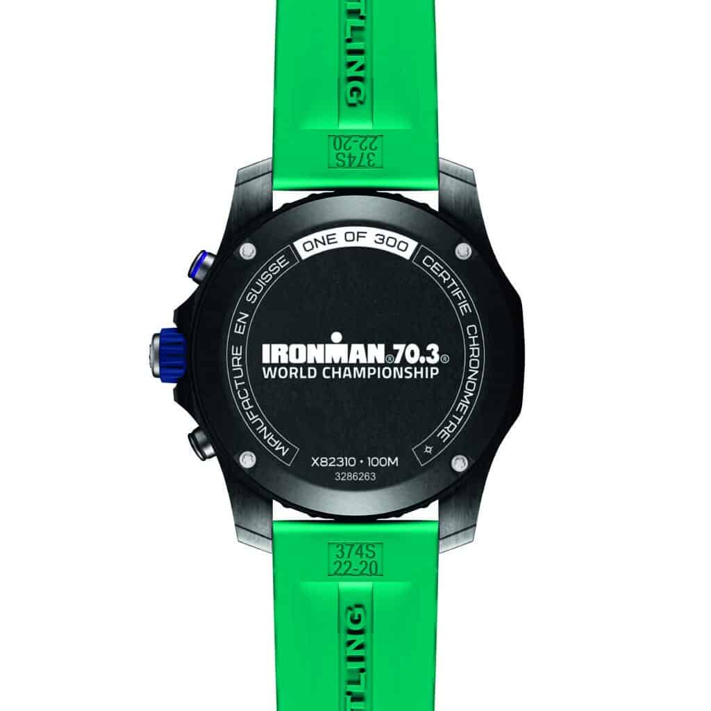 Turquoise with turquoise inner bezel with pulsometer scale, black chronograph counters, and IRONMAN® IRONMAN 70.3 World Championship Marbella logo at 6 o’clock. Super-LumiNova® luminescent numerals, hour and minute hands