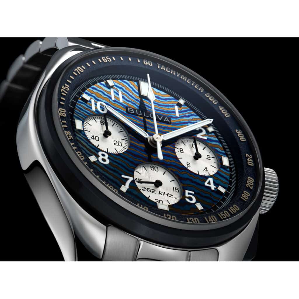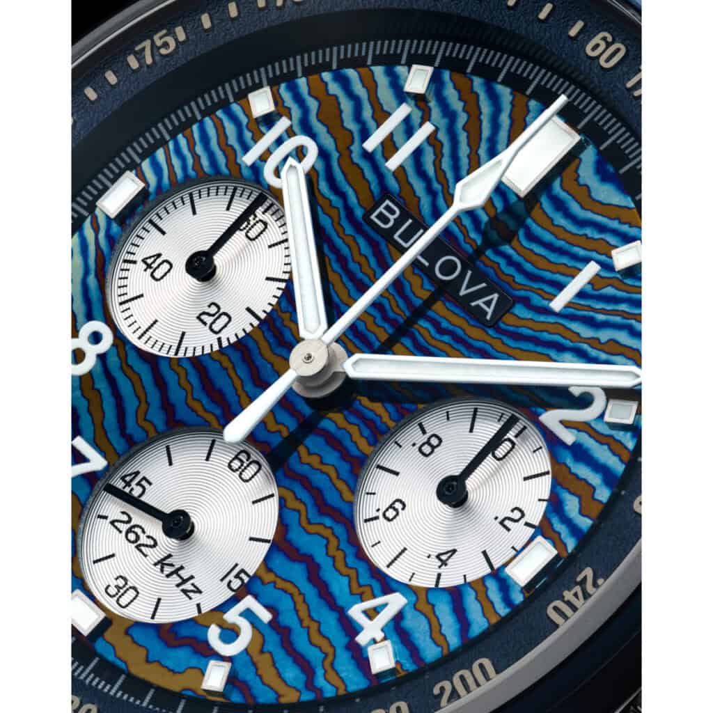 Rooted in the legacy of the original Lunar Pilot and engineered to withstand extreme conditions, the anniversary edition merges technical craftsmanship with Rosinhole’s space-age artistry. Each watch features a striking Timascus dial, crafted by layering and forging various titanium alloys and heat treating them to reveal vibrant, one-ofa-kind timepieces. The kaleidoscopic dial shimmers with futuristic tones that echo Rosinhole’s visual language, while remaining grounded in Bulova’s commitment to craft and precision.