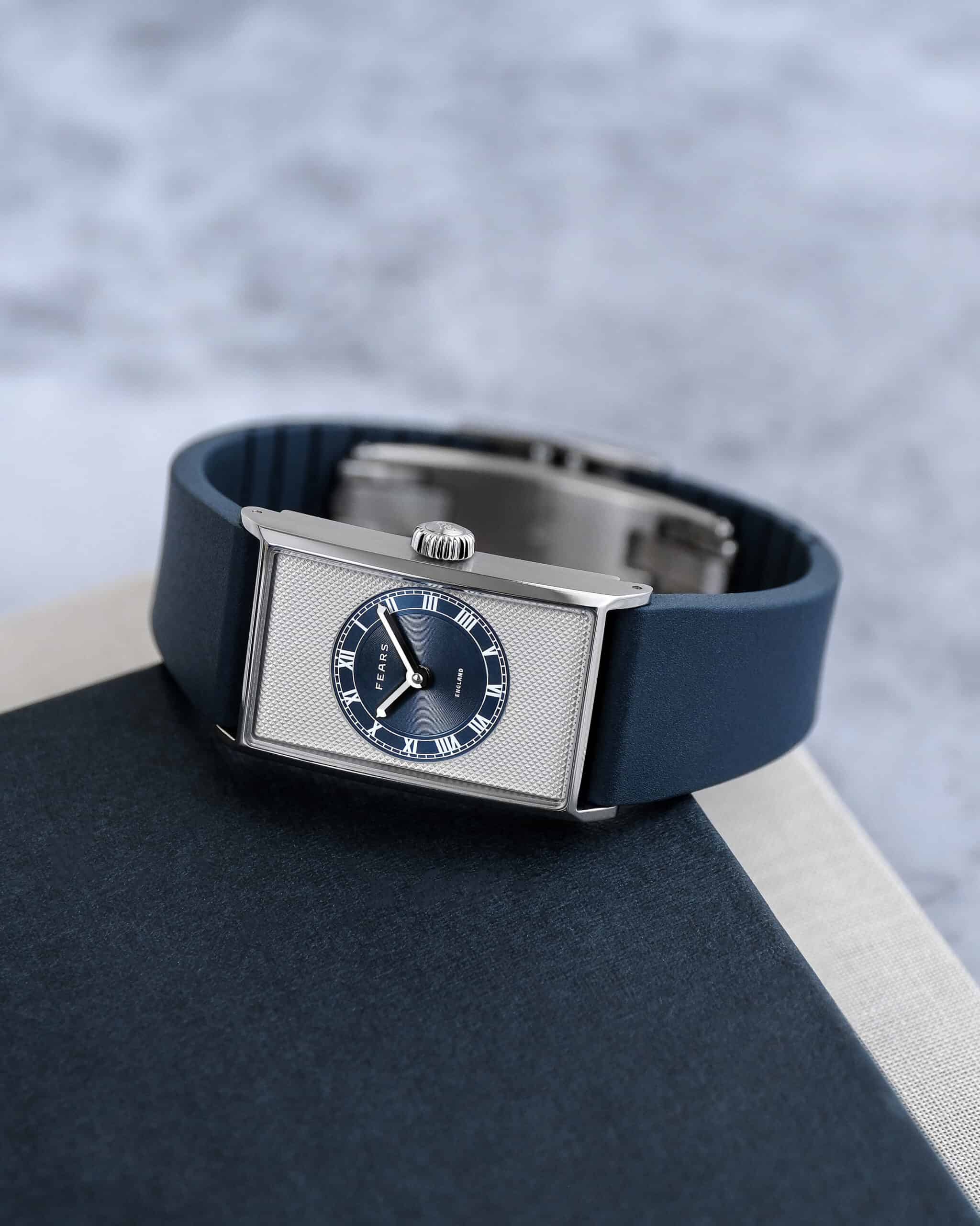 “The launch of the new Arnos family and with it, the first Arnos Pewter Blue watch, is an important moment for Fears. This new family joins our core collection of Redcliff and Brunswick watches, each with their own distinctive shapes and identities. The Arnos gives us a new canvas with which we can express the elegance of the Fears design language. In 2021 when we celebrated the 175th anniversary of my great-great-great-grandfather, Edwin Fear, establishing Fears an important piece from our archive was revived. The 175-piece, limited edition, Archival 1930 was born and since then I’ve been keen to have a rectangular watch back in our core collection. Fears is fortunate to have such distinctively proportioned rectangular examples in its past catalogue, and this proved to be the perfect base for the first new Arnos watch. The idea for a blue circle within a grey rectangle came to me one weekend and our head designer, Lee Yuen-Rapati, then promptly brought the concept to life in the most striking of ways.