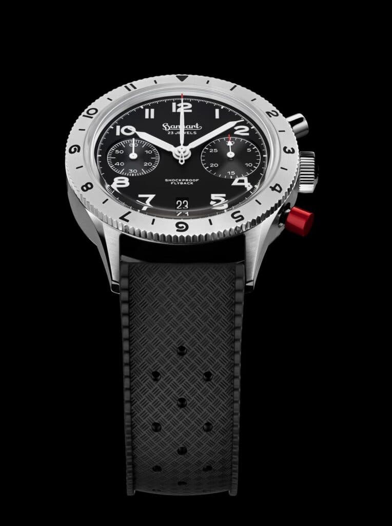 True to Hanhart’s philosophy, the Red Lion Mk II places readability above all else. The matte black dial features crisp white Arabic numerals and a clean layout anchored by the signature ‘Big Eye’ 30-minute counter at 3 o’clock.