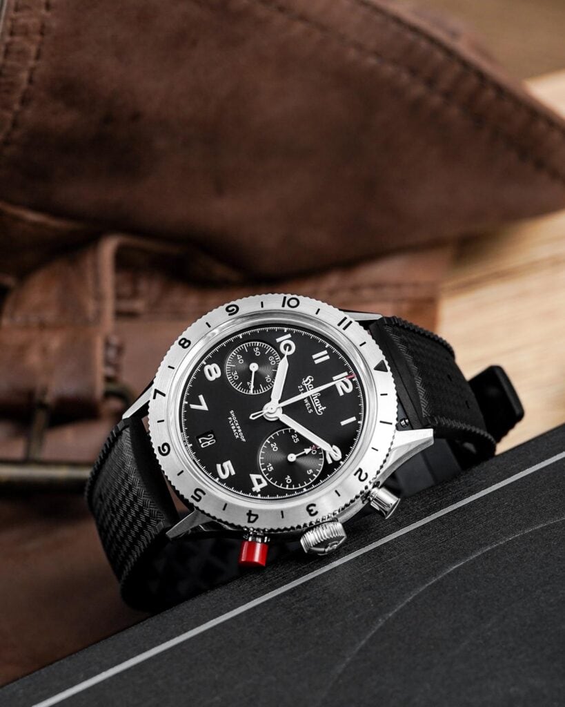 Legend tells of a pilot’s lover painting the pusher red so he would remember her while flying missions. In practice, it also served a crucial purpose: preventing the accidental resetting of the chronograph. Today, it remains a vivid emblem of Hanhart’s enduring identity.