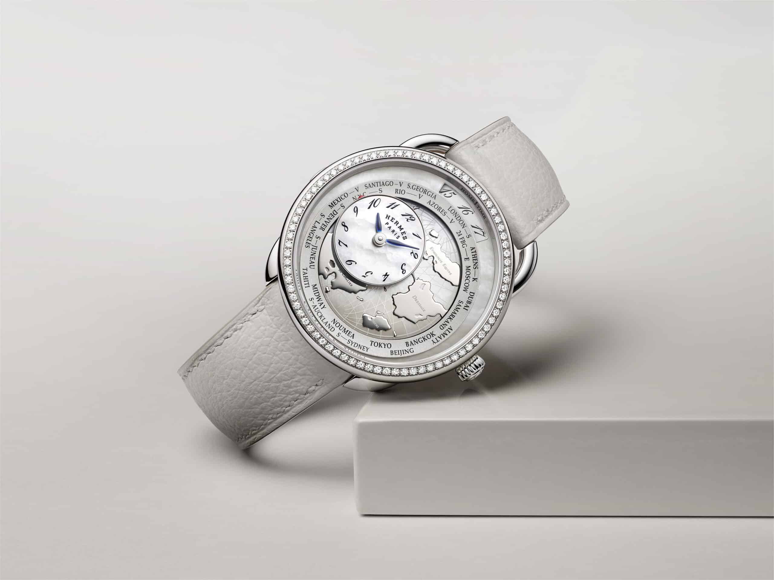 A new version of the Hermès Arceau Le Temps Voyageur is now available in a white set with diamonds a mother-of-pearl dial.