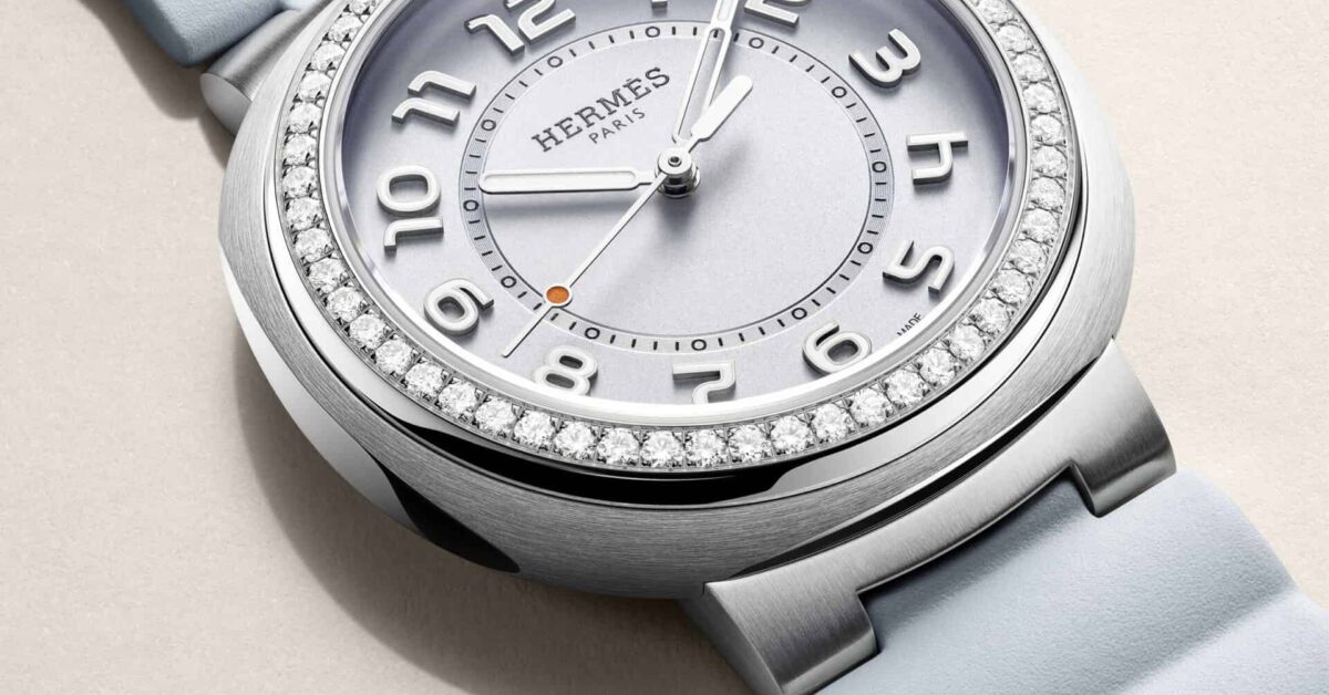 Reinterpreting a simple geometric shape, the centre of the Hermès Cut watch features the azure freshness of the sky, highlighted by a matching strap. Bold strokes, accurate touches, sharp lines: the hand paves the way for geometric expression on the material to be shaped, creating angles that...