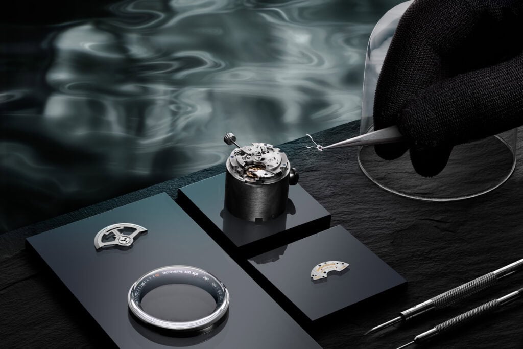 The new ocean grey dial is bold and visually striking, thanks to the richness of the lacquer and the contrast of bright orange details that speak to the chronograph’s sportier side. Complex in construction, the dial is composed of a central disc, a middle ring, to which the hour markers are applied, and an outer ring that is marked with the tachymeter scale. Sun-ray brushing on the central disc creates a subtle contrast with the smooth gloss of the hours ring; on both sections, the colour of the lacquer is graduated from light to dark, adding great visual depth to the dials.