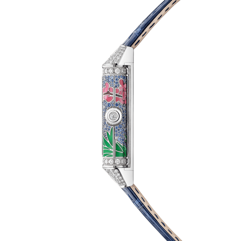 The artistry is staggering. Grand Feu champlevé enamel, fired repeatedly at temperatures reaching 800 degrees Celsius, creates intense, luminous hues. Paillonné enamel introduces fragments of 24K gold leaf, adding a subtle shimmer, while gem-setting techniques, including grain and snow setting, envelop the cases in cascades of diamonds. Every detail is painstakingly executed, often requiring well over 100 hours of work per piece.