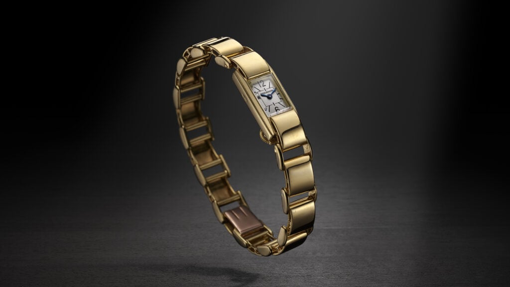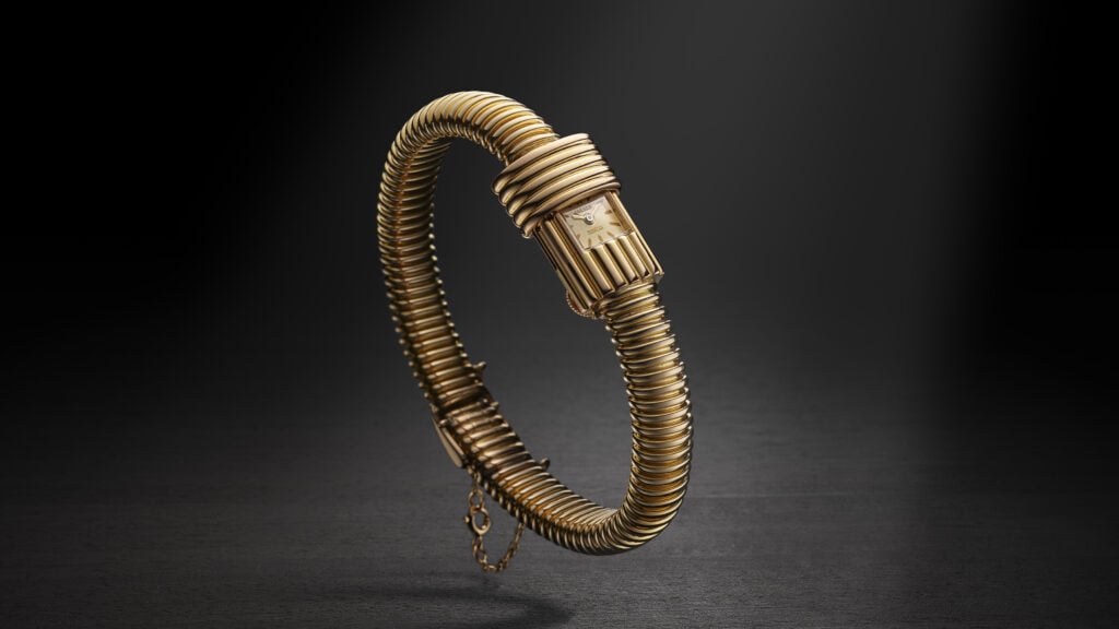 The timepieces selected in the fourth capsule collection are ranging from diamond-set Art Deco cocktail watches to design-forward pieces from the 1940s and ’50s. Among these boldly styled pieces is a Duoplan Tubogas secret watch in 18K (750/100) yellow gold from c.1950, its distinctive geometry defined by strong vertical and horizontal ribs, and, from c. 1941, a Duoplan Chaine set on a bracelet of broad, yellow gold links. Clearly demonstrating the shift in tastes over the decades of the mid-20th century, a 1960 High Jewellery secret watch is set into a white gold bracelet of diamonds and sapphires set in rivière style, and fitted with Calibre 101, the smallest movement in the Duoplan family.