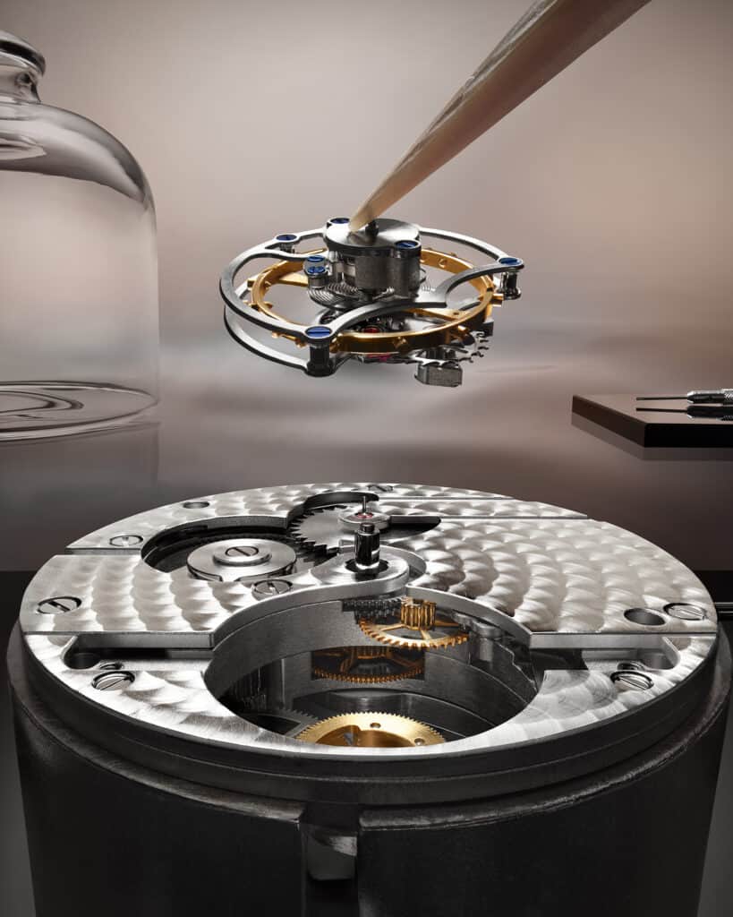 The anthracite grey dial provides a dramatic backdrop for the tourbillon and the date display, and reflected light dances across the sunray pattern of the guillochage with every movement of the wrist. The hand-guilloché pattern is a work of immense precision and skill: each of the 180 ‘sun rays’ required six passages of the hand-operated rose engine lathe, making 1,080 lines altogether. Guided only by the eye and hand, the master guillocheur must ensure that every line is absolutely straight, evenly spaced and perfectly aligned, radiating out from the centre to the edges of the dial. In addition, the date sub-dial is hand-guilloché in a circular pattern (known in French as azurage) to create a subtle texture that contrasts with the sunray.