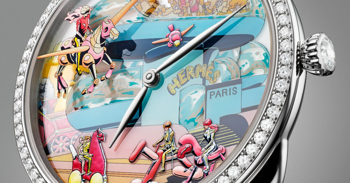 Surrounded by diamond setting, the futuristic Faubourg displays its curved shapes and bright colours on the Arceau Hermès locomotion. Created by acclaimed French designer and director Ugo Bienvenu, the Arceau Hermès Locomotion watch transforms his vibrant, pop-art reimagining of the iconic...