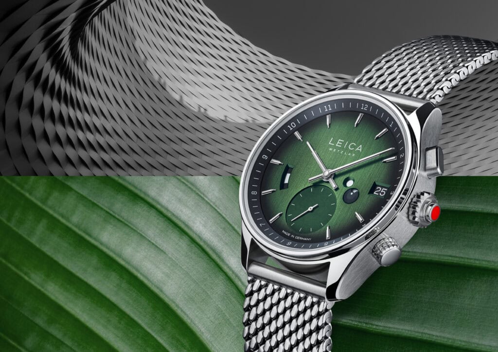 The high quality stainless-steel Milanese strap enhances the sophisticated design of the Leica ZM 1 and ZM 2 Urban Green, complementing the dial’s distinctive green-to-black gradient. Handcrafted with precision, featuring a solid, full satin finish, and bearing the original Leica engraving, the watch strap’s mesh-like material embraces every wrist, perfectly setting the tone for the new timepieces. The integrated, adjustable deployant buckle and quick-change spring bars on both sides exemplify meticulous craftsmanship and precision engineering.