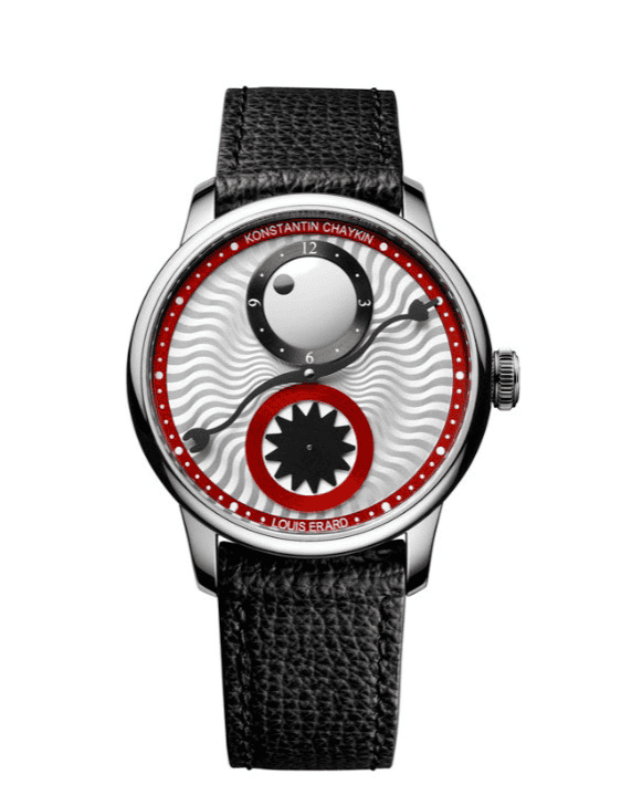 • The face: A colored minutes ring with the Louis Erard logo at 6 o’clock and Konstantin Chaykin’s name at 12 o’clock. Red for Chaykin, blue for Louis Erard