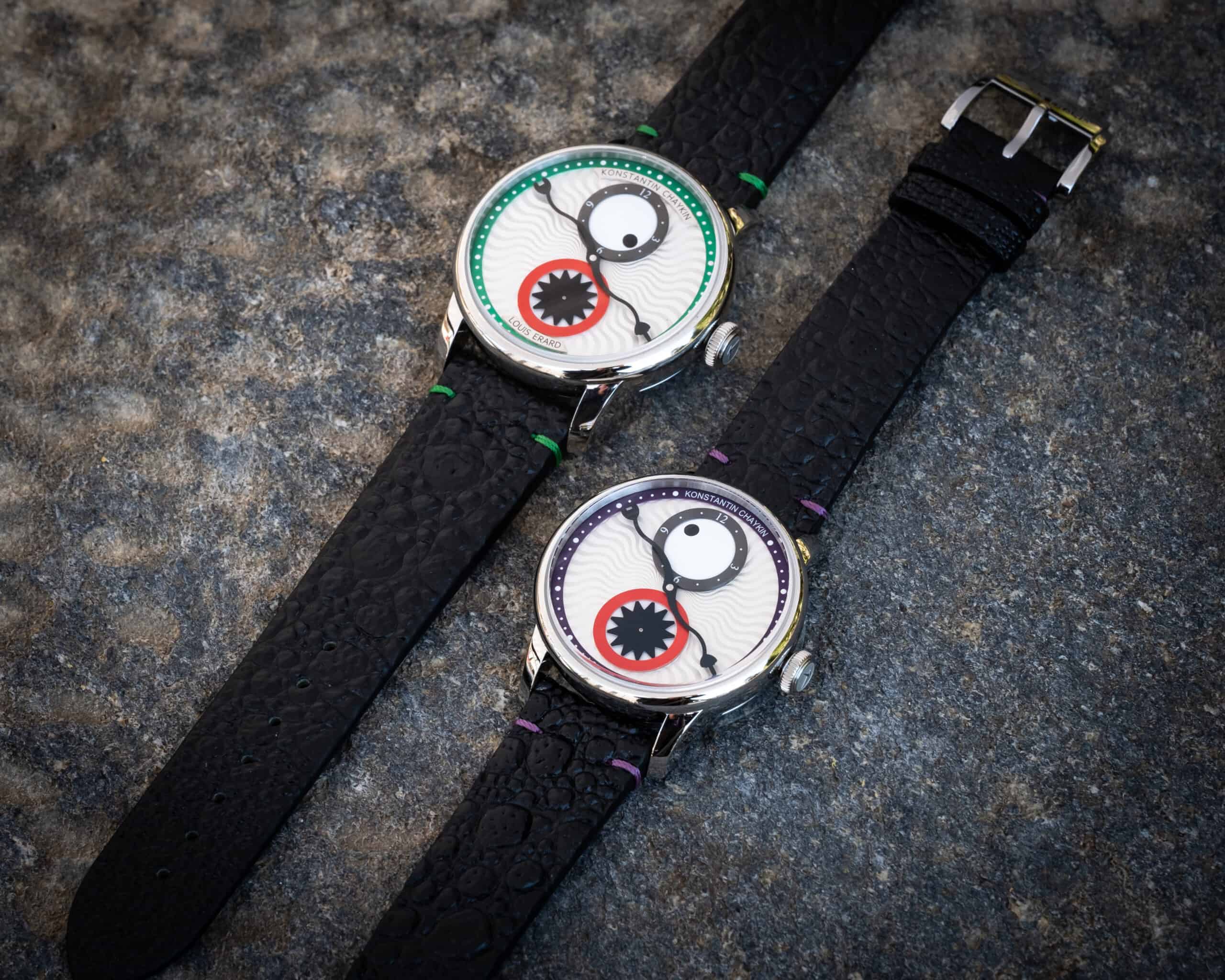 The meeting between Louis Erard and Konstantin Chaykin ( member of the Académie Horlogère des Créateurs Indépendants or AHCI) gave birth to a strange creature. A one-eyed monster to which the mechanics give life. The difference is that this time we are not even looking at the time, it is the time that is looking at us: the hour is a single, large, round eye. This cyclopean gaze takes up the original elements of the Wristmons and more particularly of Konstantin Chaykin’s first Joker watch – whose eyes were made up of white discs marked with a dot, both pupil and indicator.