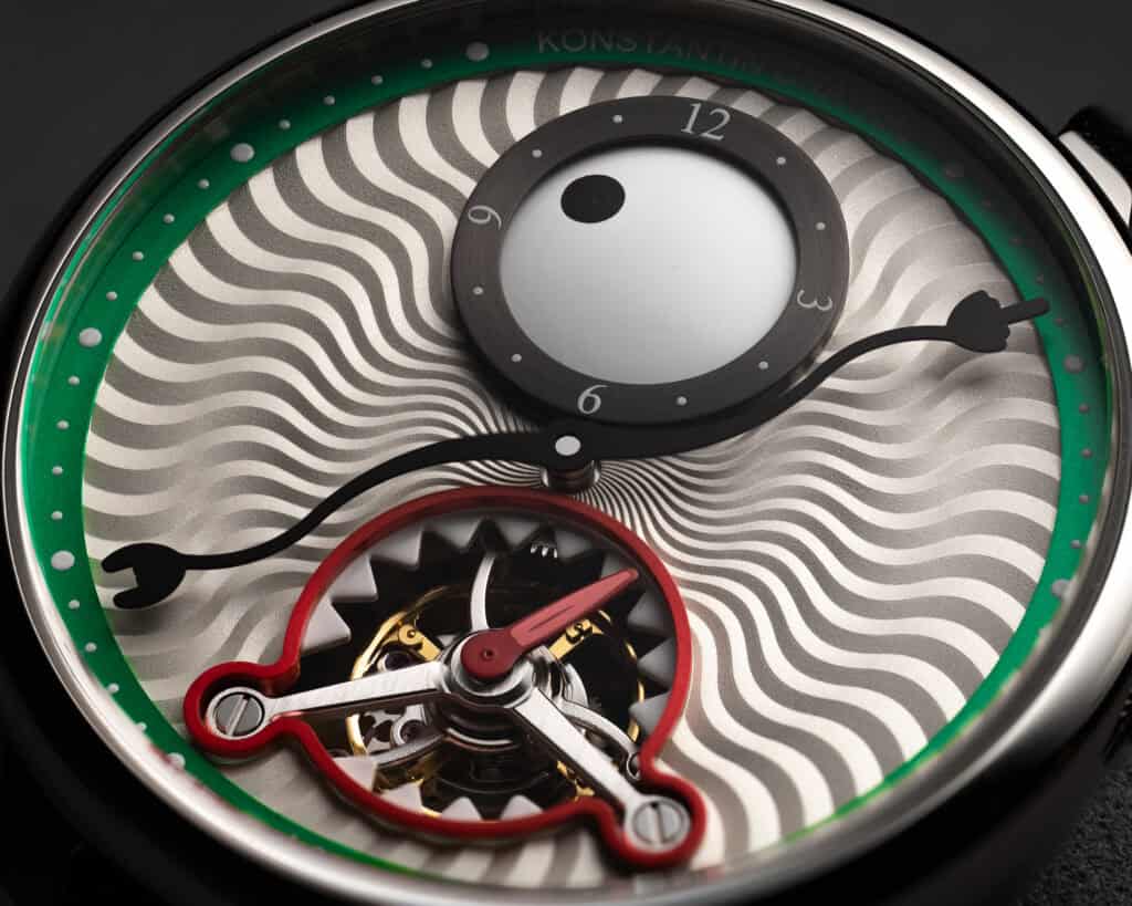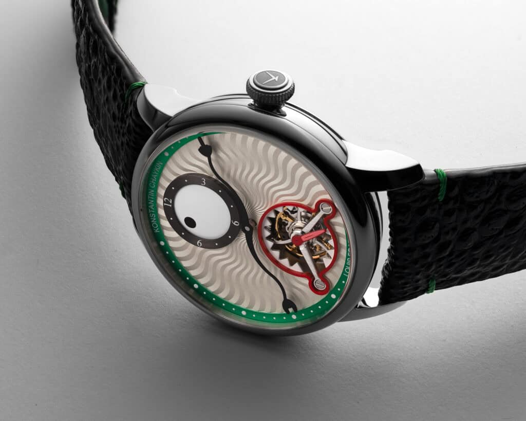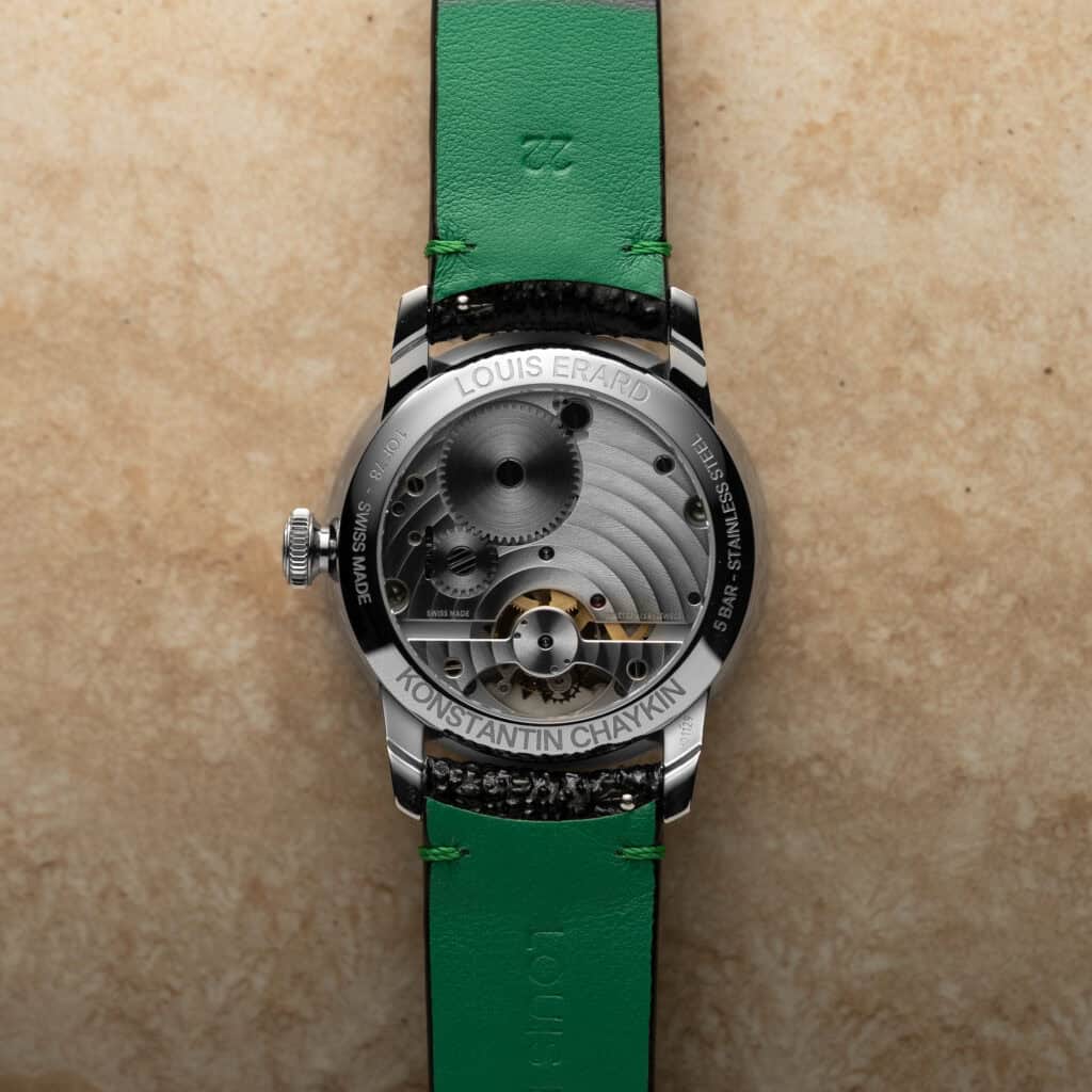 Dial: Shiny green minutes with logos transferred in white (Louis Erard at 6 o’clock and Konstantin Chaykin at 12 o’clock), silver-toned lower plate with sunray wave pattern, anthracite circular satin-finished hours flange, red tourbillon cage flange with white teeth.