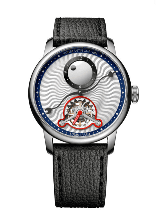Dial: Shiny blue minutes ring with logos transferred in white (Louis Erard at 6 o’clock and Konstantin Chaykin at 12 o’clock), silver-toned lower plate with sunburst wave pattern, anthracite circular satin-finished hour flange, red tourbillon cage flange with white teeth.