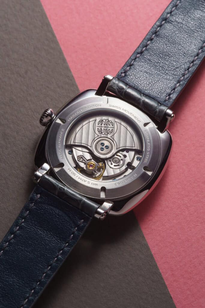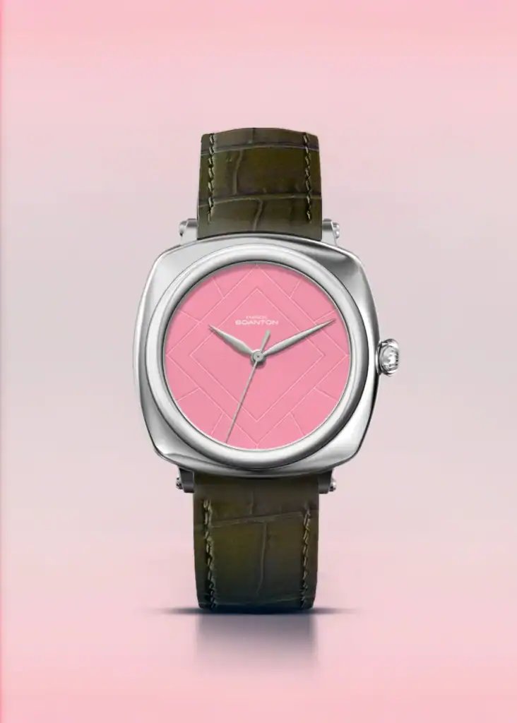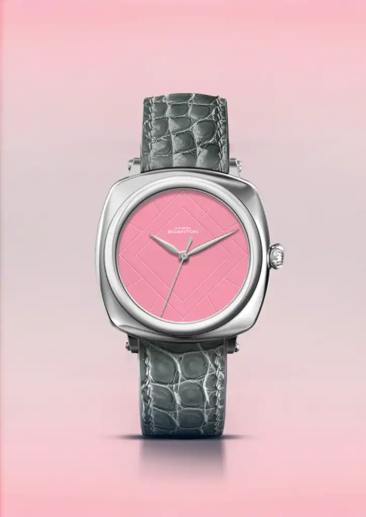 Each piece is paired with a storm-grey hand-finished alligator strap, crafted in Boanton’s Parisian atelier. The rich tone and natural grain of the leather highlight the pink dial’s elegance. A bottle-green grained calf strap is also offered, adding a bolder, more contemporary dimension.