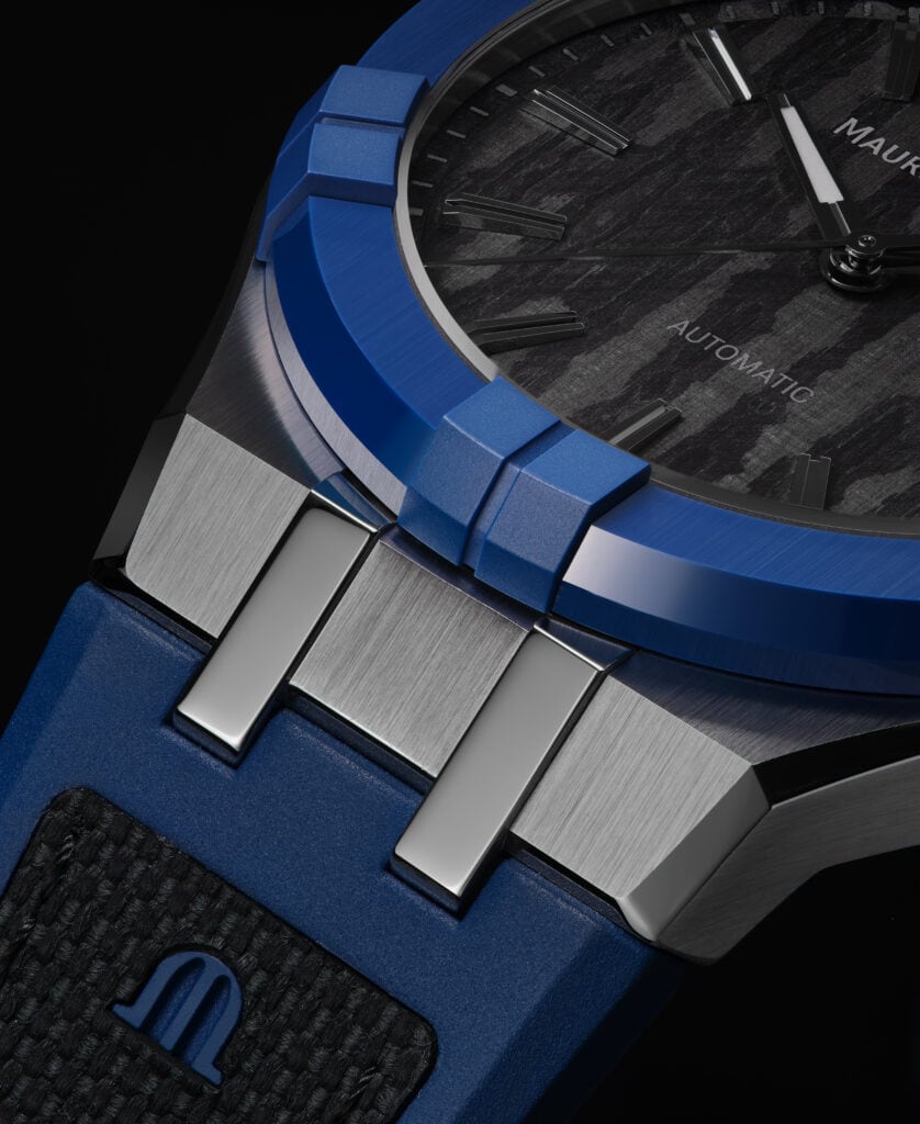 - BRACELET/STRAP: Turquoise and black, bi-rubber strap with imitation nylon-textured rubber, featuring the Maurice Lacroix ‘m’ logo (varies depending on colour)