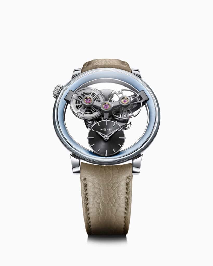 SP One movement developed in-house by MB&F, featuring signature balance wheel and inclined time dial.