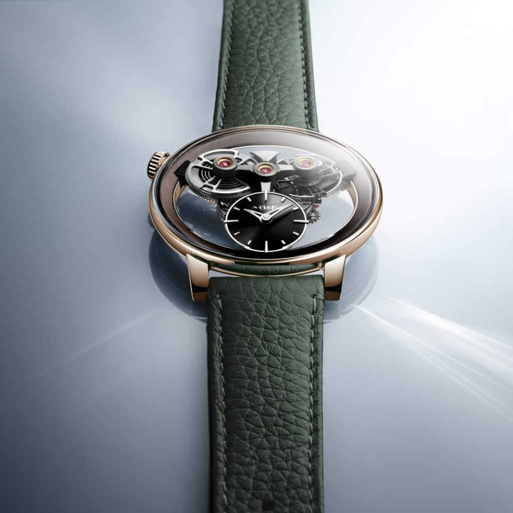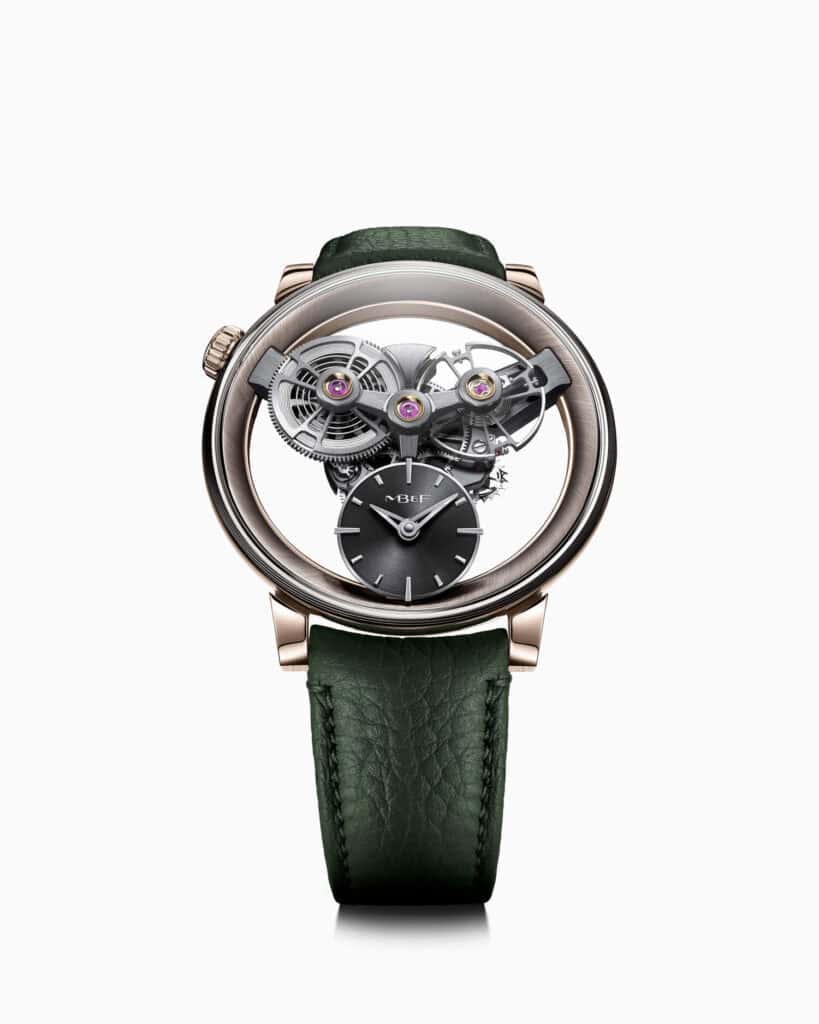 Collectors will appreciate the nuance—conical gears, invisible supports, and the echo of classical watchmaking elevated into futuristic sculpture. Turn the watch over, and MB&F’s finishing prowess is on full display: hand-made anglage, internal angles, polished bevels, gold chatons, and engraved flourishes—all laid across a canvas of satin-brushed and micro-blasted finishes.