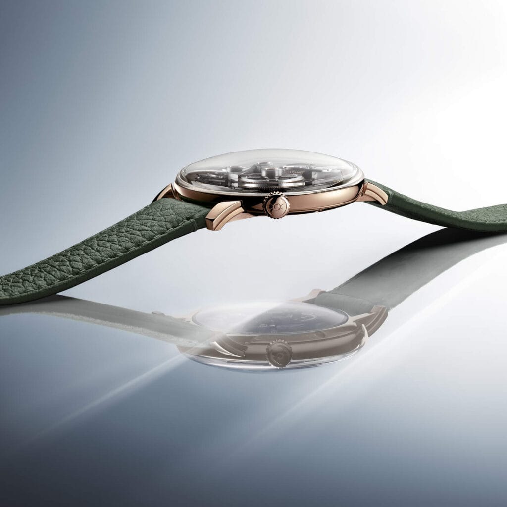 Though it’s the smallest and slimmest MB&F to date, SP One is no less dimensional. The tilted dial, floating balance at 2 o’clock, and suspended single barrel are designed to mesmerise—each identical in diameter, visually orbiting at the heart of the movement. This visual symmetry is no illusion: the architecture is deliberate, with bridges and components hidden beneath, drawing the eye solely to the ‘stage’.