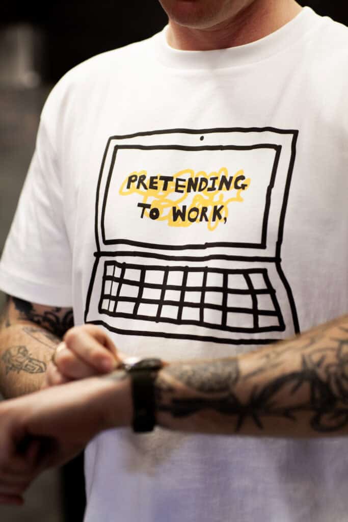 Each of the five t-shirts in The 9-5 Facade collection represents a different day of the work week, with Monday’s slogan begging for a boatload of coffee and Friday’s dreaming of beer and freedom.