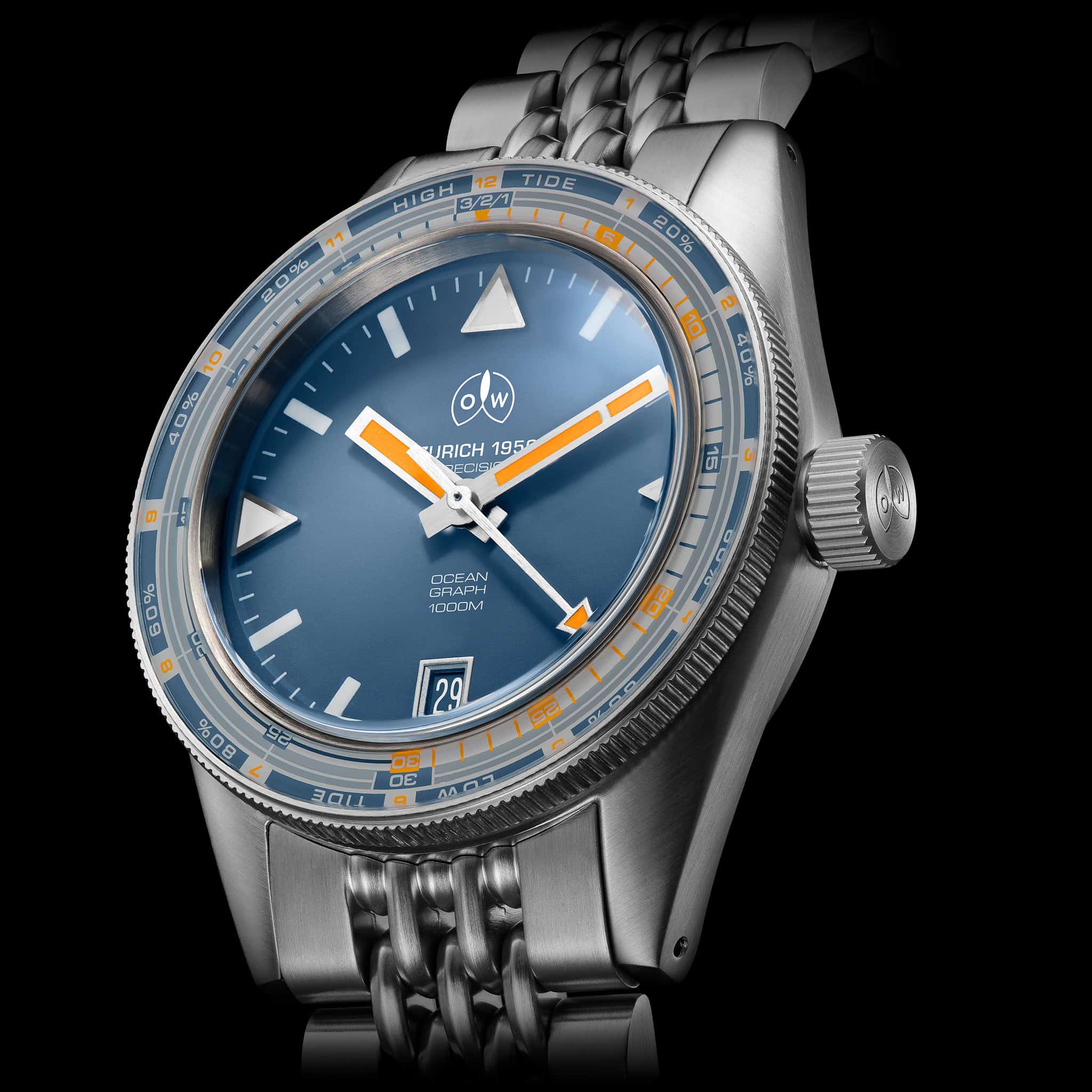 The Ocean Graph MkII pairs rugged engineering with refined aesthetics. Its distinctive blue dial and orange accents ensure instant readability in low light, while the ultra-light perlon strap provides comfort and durability both above and below the surface. The streamlined case architecture, brushed steel finish, and gently domed sapphire crystal reflect Ollech & Wajs’ signature blend of utilitarian strength and Swiss craftsmanship.