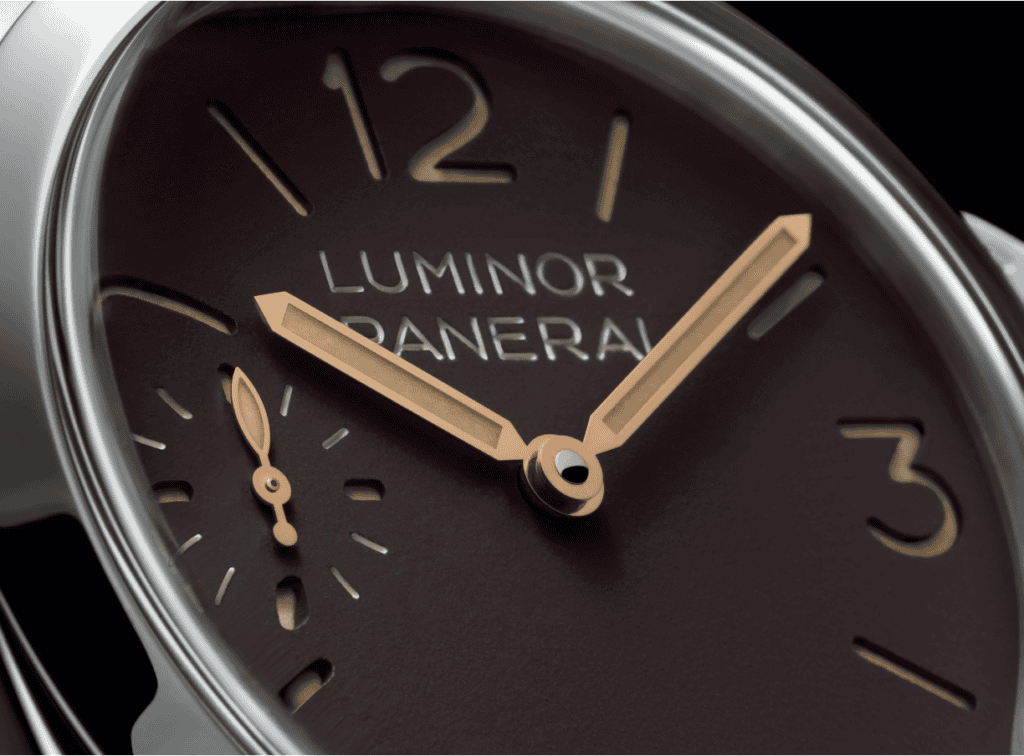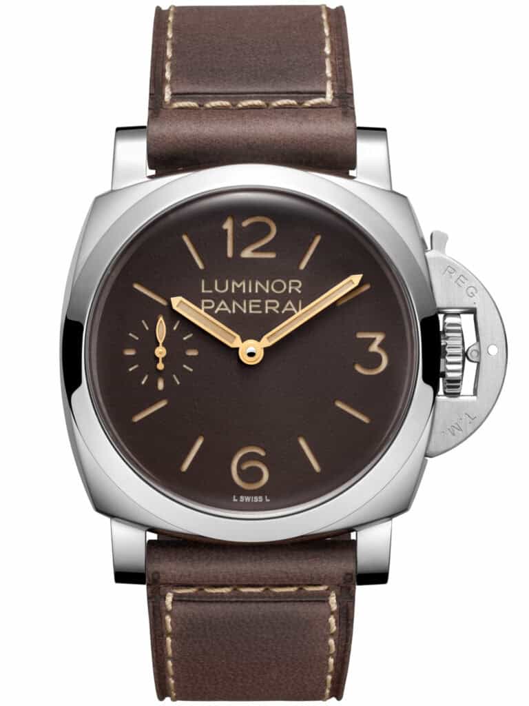 The Luminor PAM01731 features a rich tobacco-brown sandwich dial with beige Super-LumiNova® indexes and vintage-style double pencil hands. A small seconds display positioned at 9 o’clock completes the classic layout. The watch is paired with a dark brown vintage-style calf leather strap and is also supplied with an additional rubber strap in the same tone.