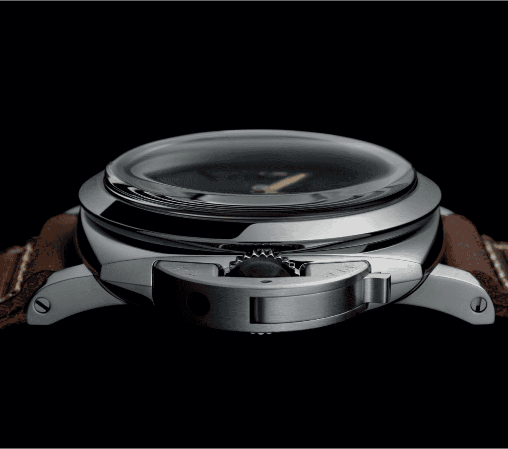 For the first time, Panerai translates this historic case architecture into a more wearable 44mm format. The new models retain the essential geometry, including a true cushion-shaped middle case, a flat crown bridge and contrasting brushed and polished finishes, preserving the proportions of the original while adapting them for modern wrists.