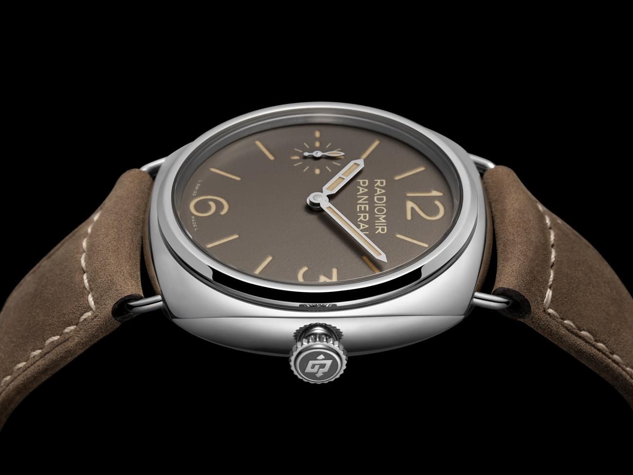 Set in a polished steel 45mm case with the iconic cone-shaped crown, the watch features a brown matte hollowed dial with indexes and numerals only at twelve and six o’clock while the beige Super-Luminova® illuminates in green in the dark. The hour hand is segmented in half – an emblematic feature of Radiomir from its inception. Matched with a brown leather strap, the timepiece’s monotone shade highlights the brown dial, a matte colour style that features for the first time within the collection.