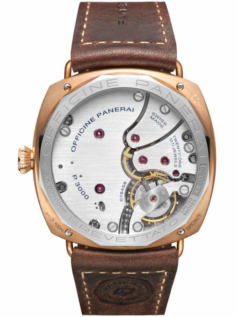 Inside beats the hand-wound P.3000 calibre, offering a robust three-day power reserve. Large bridges, thick screws, twin barrels, architecture inspired by Panerai’s historic military instruments and built for resilience.