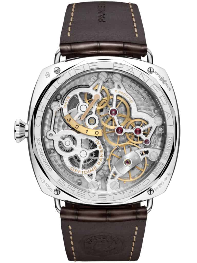 This 47mm Radiomir is forged from Panerai Platinumtech™ a proprietary alloy containing 95% pure platinum and engineered to be significantly harder than standard platinum. It carries 33% more weight than 18-carat gold, delivering a reassuring heft that reminds you this is serious horology.