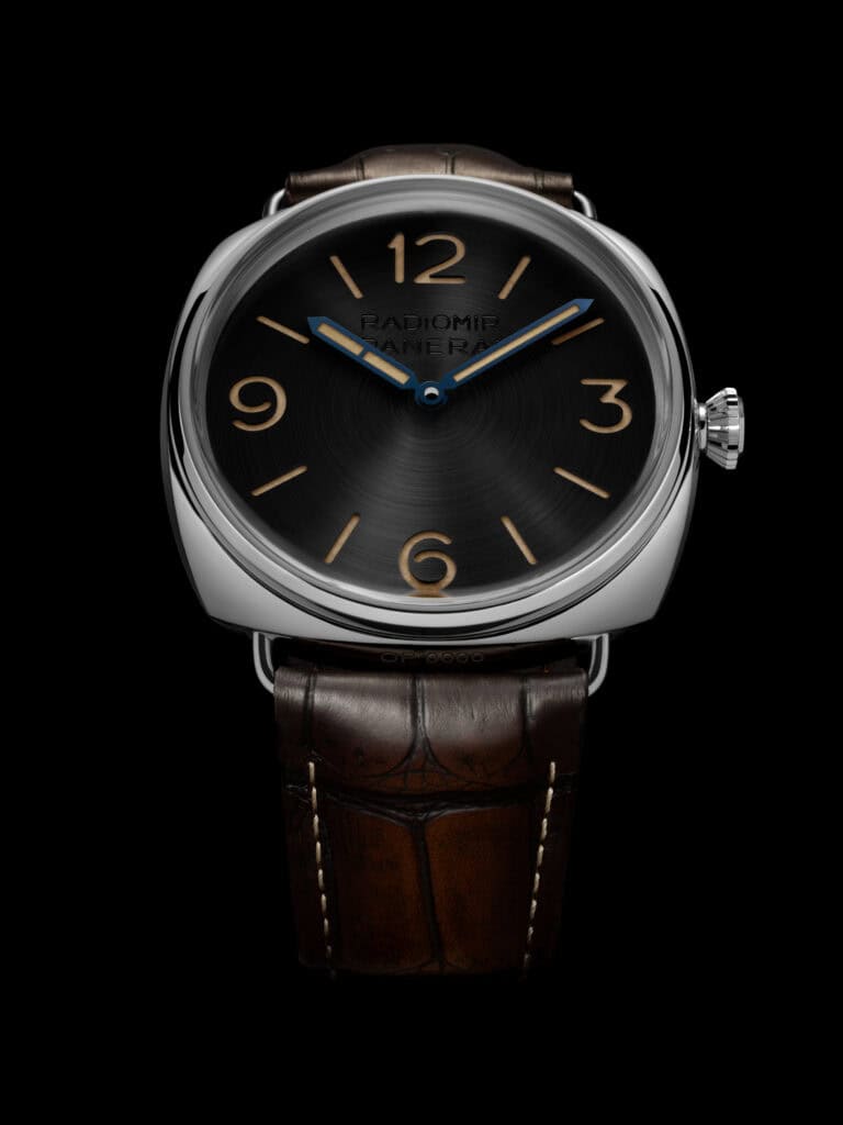 Dial: Circular sun-brushed black dial with Sandwich construction. Beige Super-LumiNova® on hours, markers and blue burnished steel hands. “Radiomir Panerai” tone-on-tone inscription at 12 o’clock.