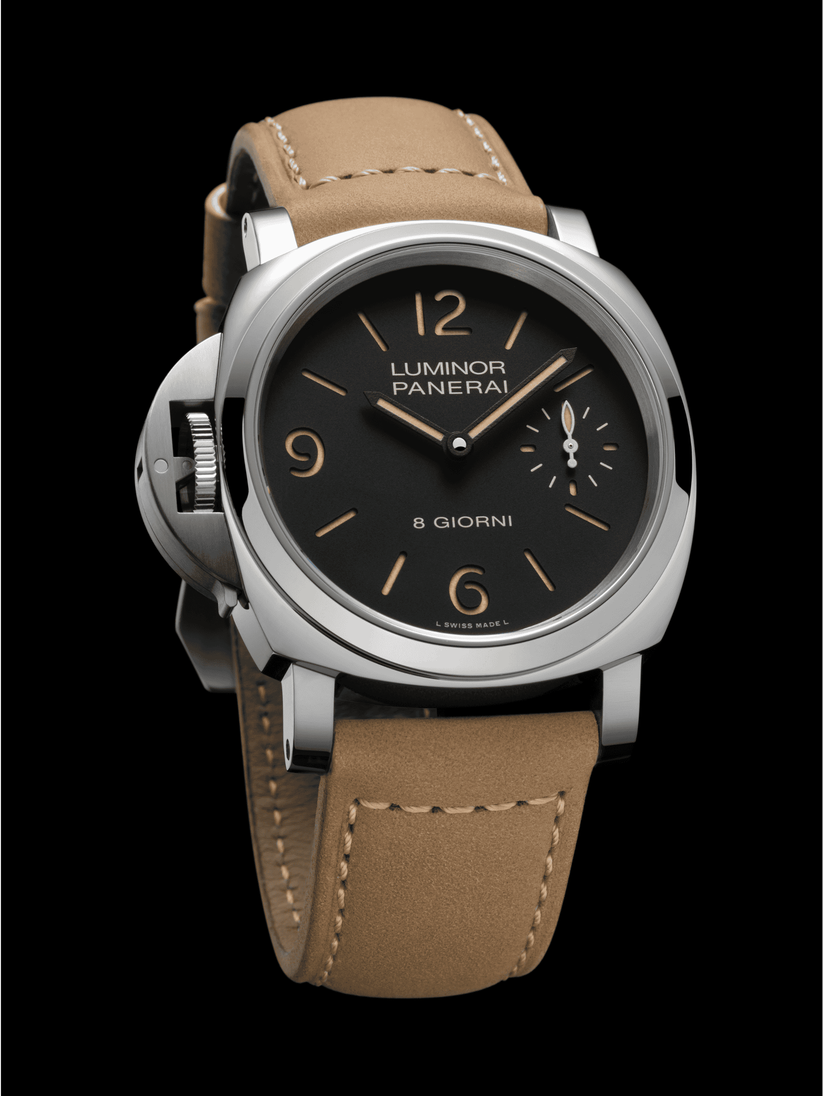 The new timepiece’s most distinctive feature is the crown positioning at 9 o’clock, complete with Panerai’s iconic crown protecting device. This design, not a mere aesthetic choice but a functional one, accommodates left-handers and those who, by choice or necessity, wear their watch on the right wrist. This 44mm marvel is designed for the modern wearer while paying respect to its roots. Its polished steel case and bezel enclose a black dial, illuminated by beige Super-LumiNova®.