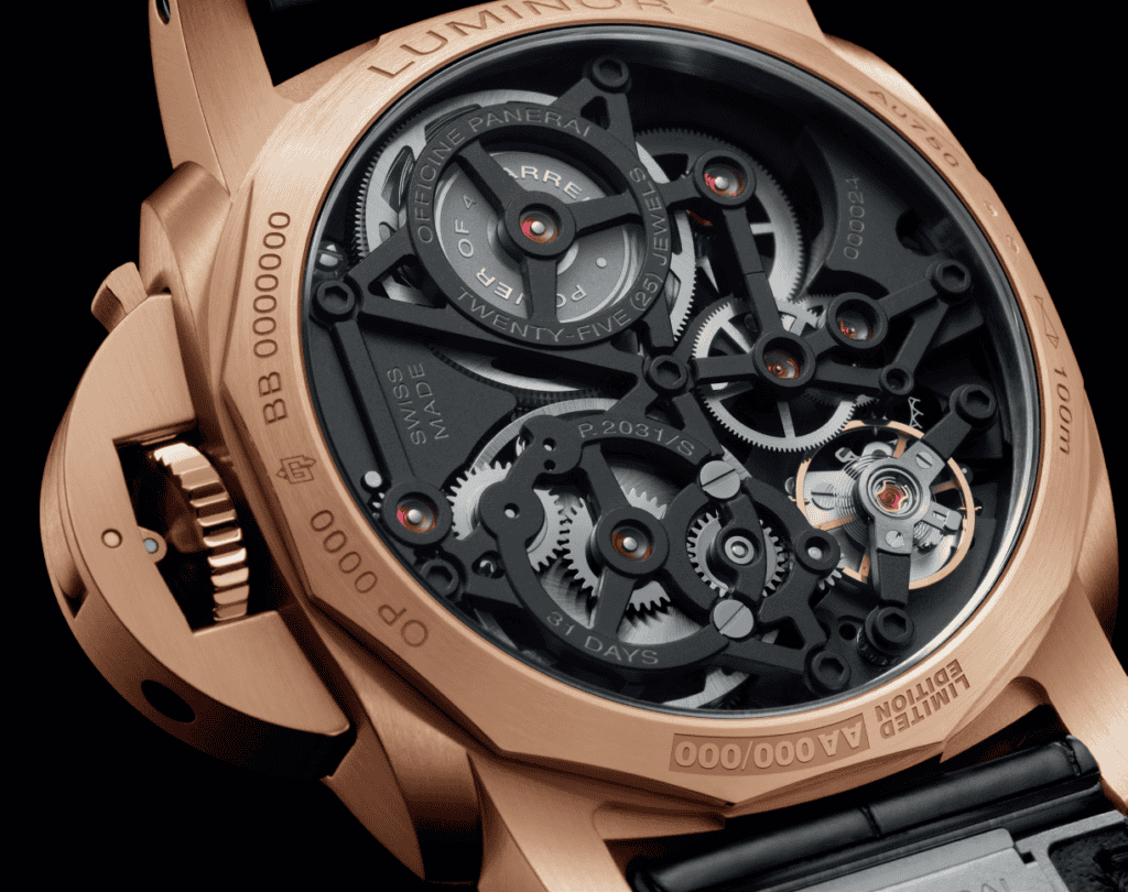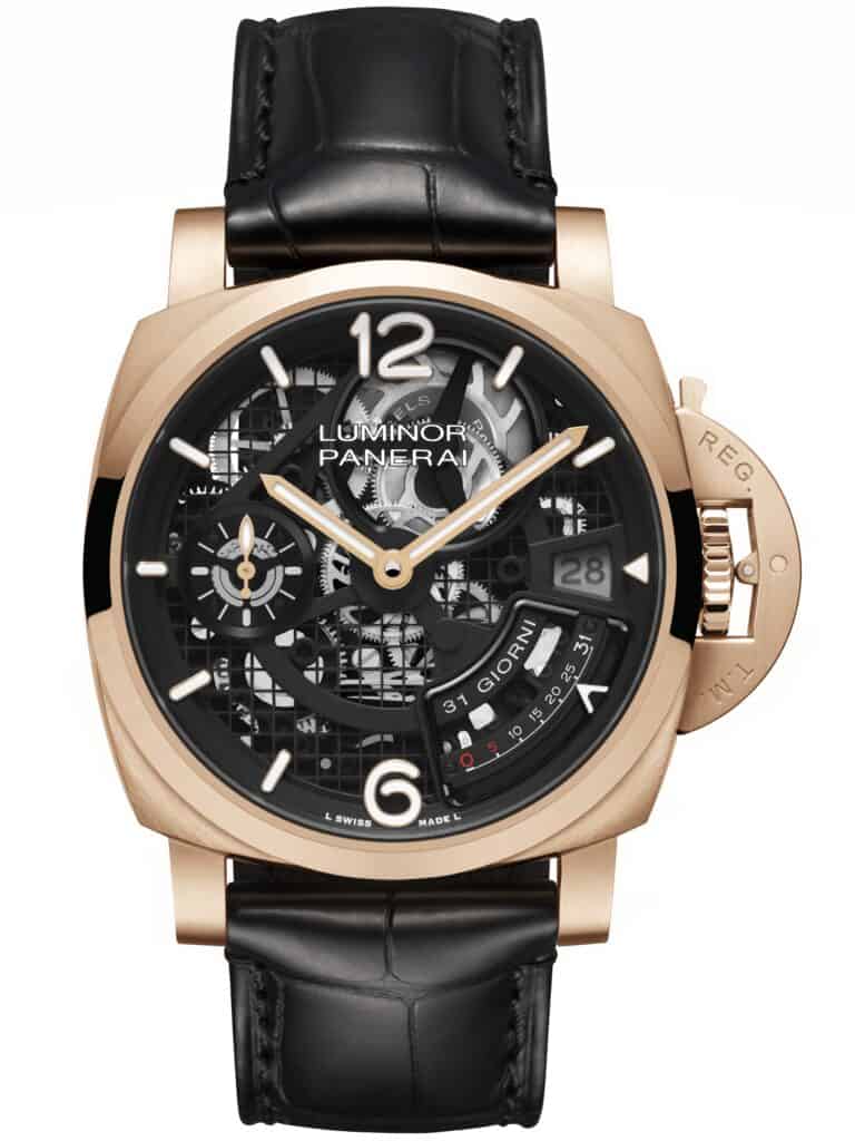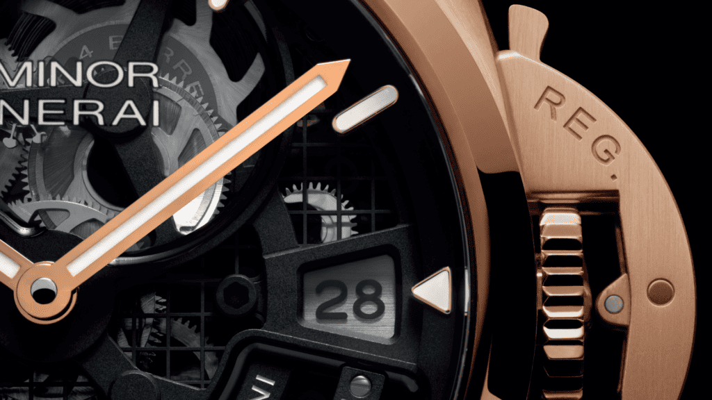 Despite its mechanical complexity, the PAM01631 remains faithful to Panerai’s philosophy of producing clear and functional instruments designed for optimal legibility and practical use. The watch is housed in a 44mm Panerai Goldtech™ case – a proprietary alloy combining gold and copper with small amounts of platinum and silver to enhance durability. The result is a distinctive red-gold hue alongside improved resistance and longevity.