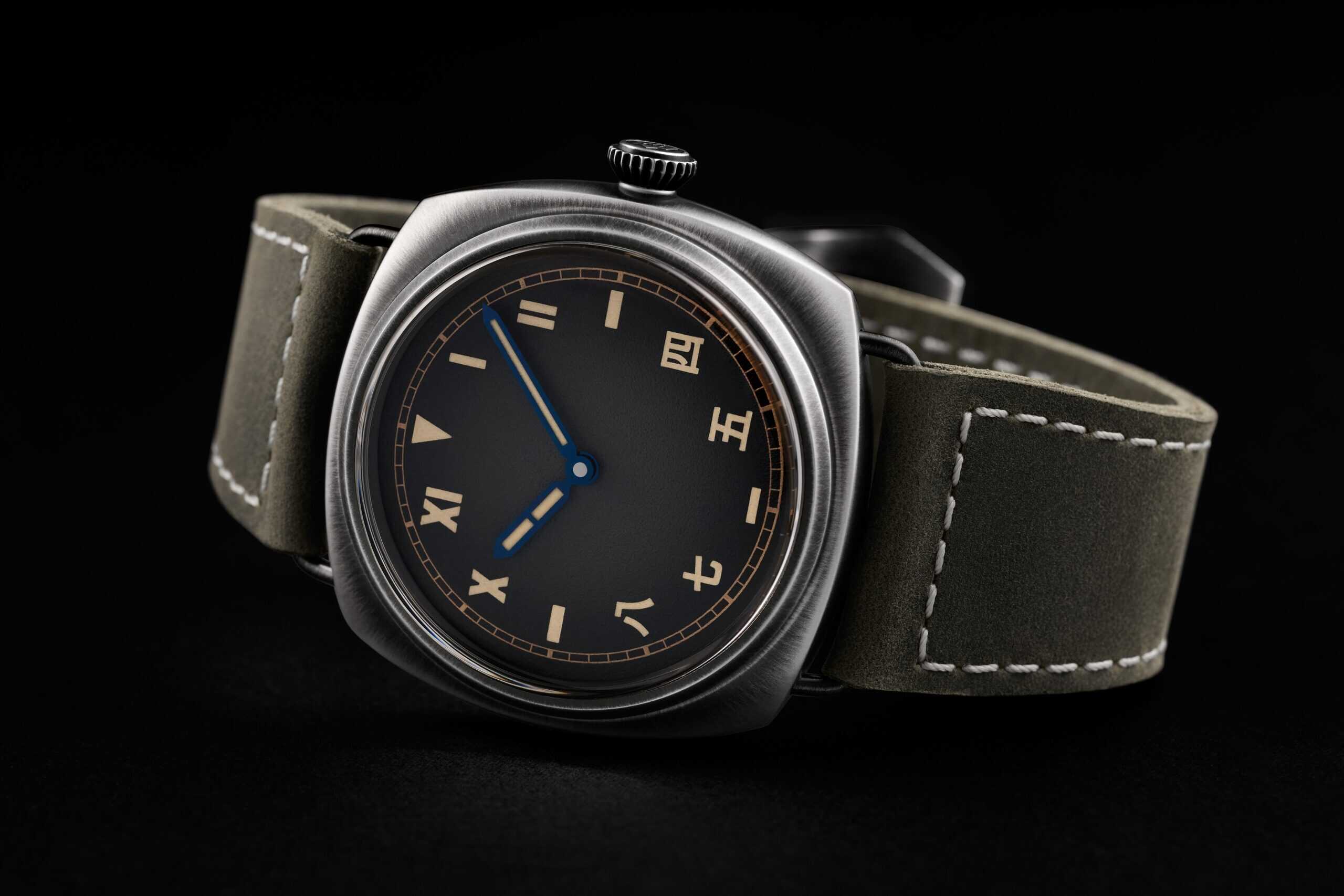 Vintage details abound: a domed sapphire crystal recalls the original Plexiglas of early military Panerai models, while beige Super-LumiNova® X1 ensures perfect legibility with a subtle green glow in the dark.