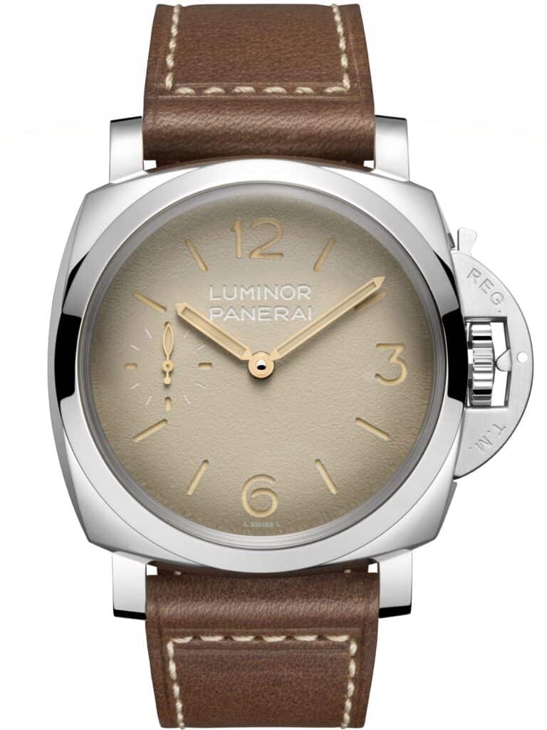Beneath the upper dial plate, beige Super-LumiNova® ensures excellent low-light legibility. The dial remains deliberately restrained, with only essential text, “Luminor Panerai” at 12 o’clock, alongside a small seconds display at 9 o’clock. Vintage-inspired double pencil hands complete the composition.