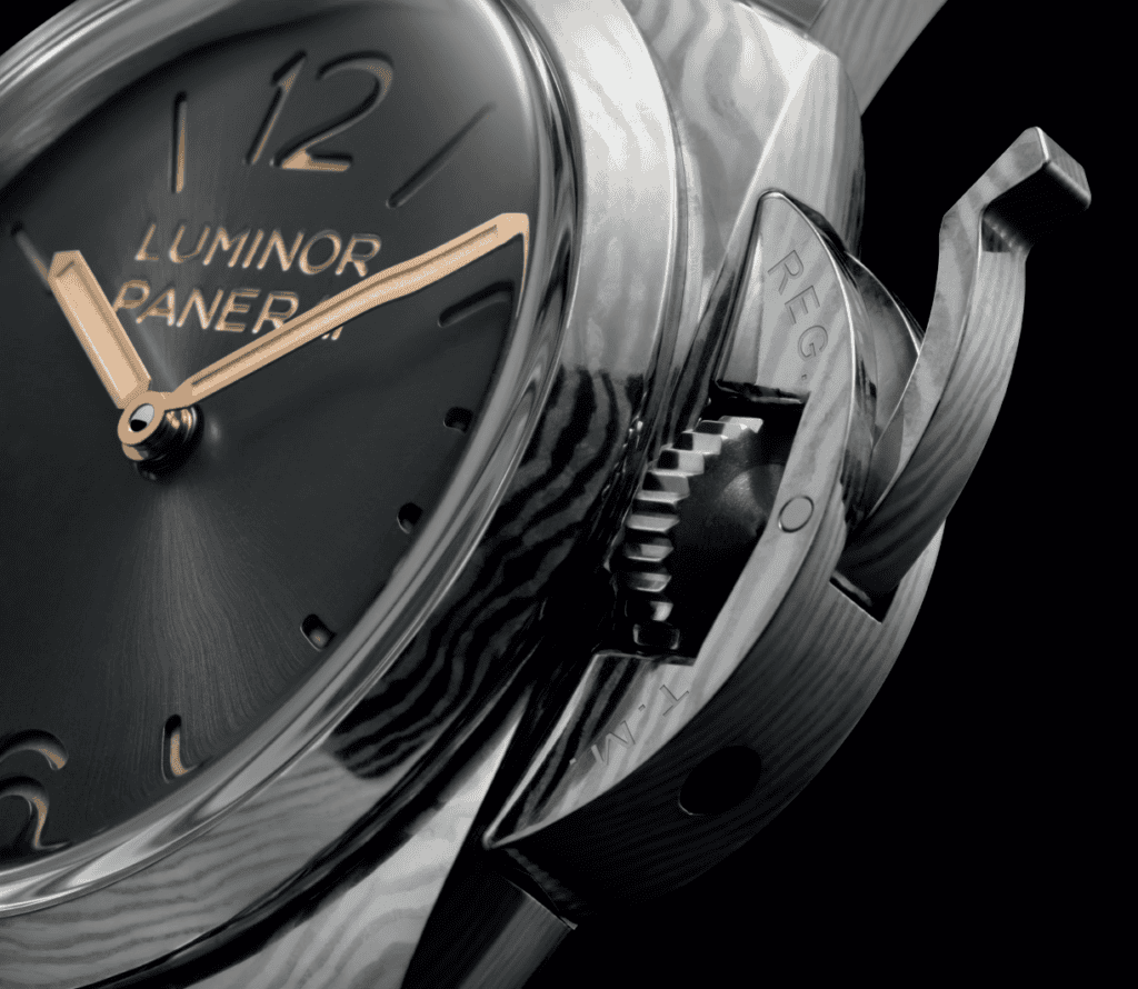 Forged titanium takes this exploration further. The material is created by bonding two grades of titanium under intense heat and pressure using a forging hammer. This process produces a highly cohesive structure with remarkable strength while revealing a striking wave-like surface pattern. Each case displays unique variations in grey tones, meaning no two watches appear exactly the same. The organic texture evokes sea currents or layered stone formations, subtle visual references to the maritime world that continues to inspire Panerai.