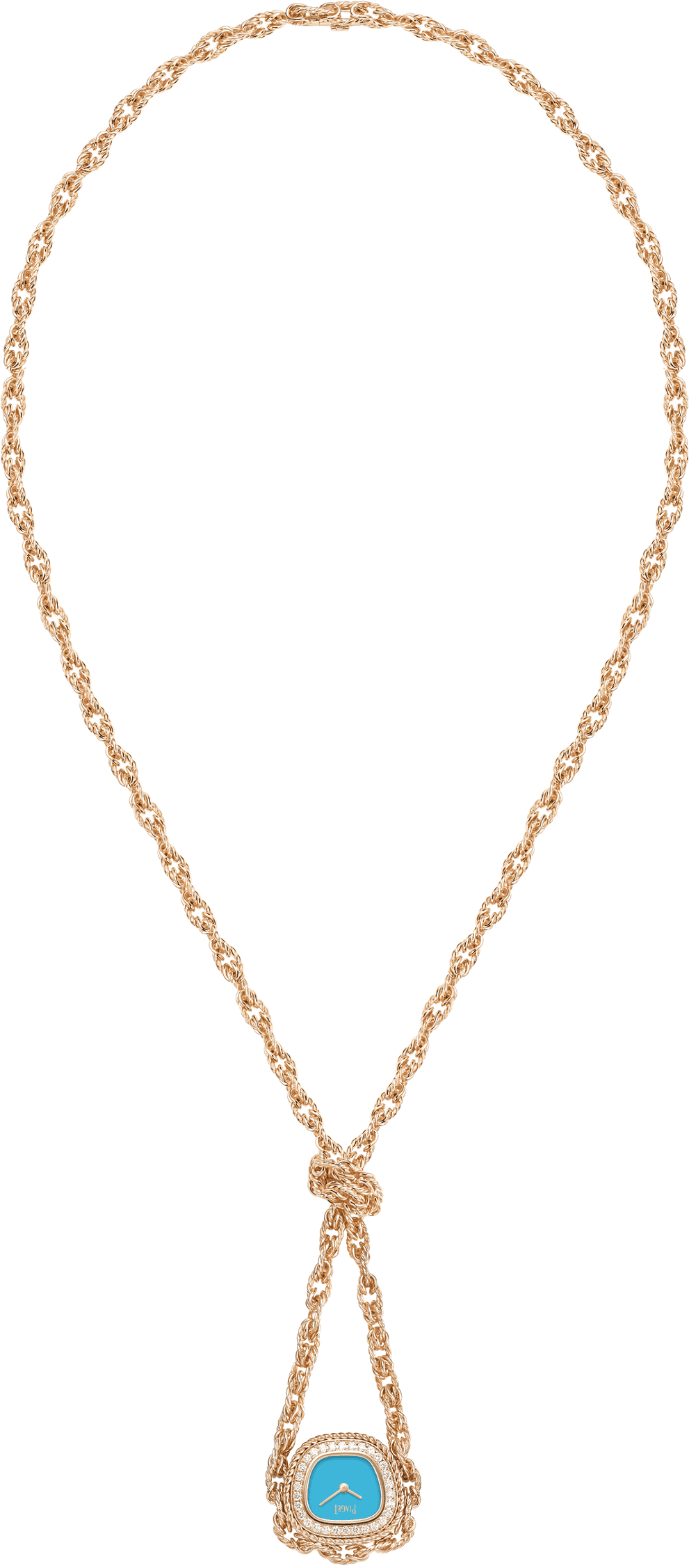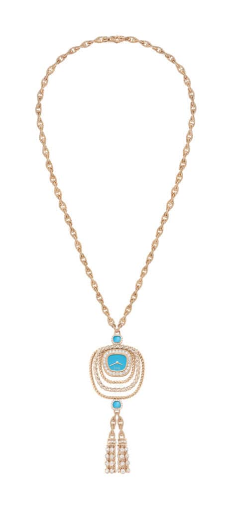 Piaget’s legacy of avant-garde watchmaking and mastery of colour continues in the new Sixtie Swinging Sautoir (above). Inspired by sketches once drawn directly by Piaget’s designers onto the pages of fashion magazines, this turquoise and trapezoid-dialled sautoir captures the era’s casual glamour with a cascading framework of diamond-set, hand twisted gold that echoes the contours of the dial like gentle ripples on the water’s surface.