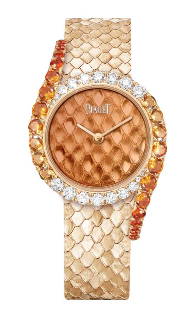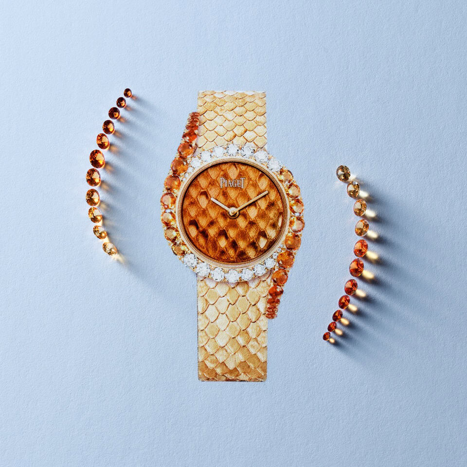 The first is pure theatre. A blaze of Grand Feu orange enamel laid over hand-engraved gold, executed in a rare snake-skin motif first explored in 2019. The dial glows with molten intensity, encircled by diamonds that spill into a graduated sweep of spessartite garnets. The engraving is no mere texture, it is trompe-l’oeil goldsmithing of the highest order, demanding absolute control of depth, rhythm and light.