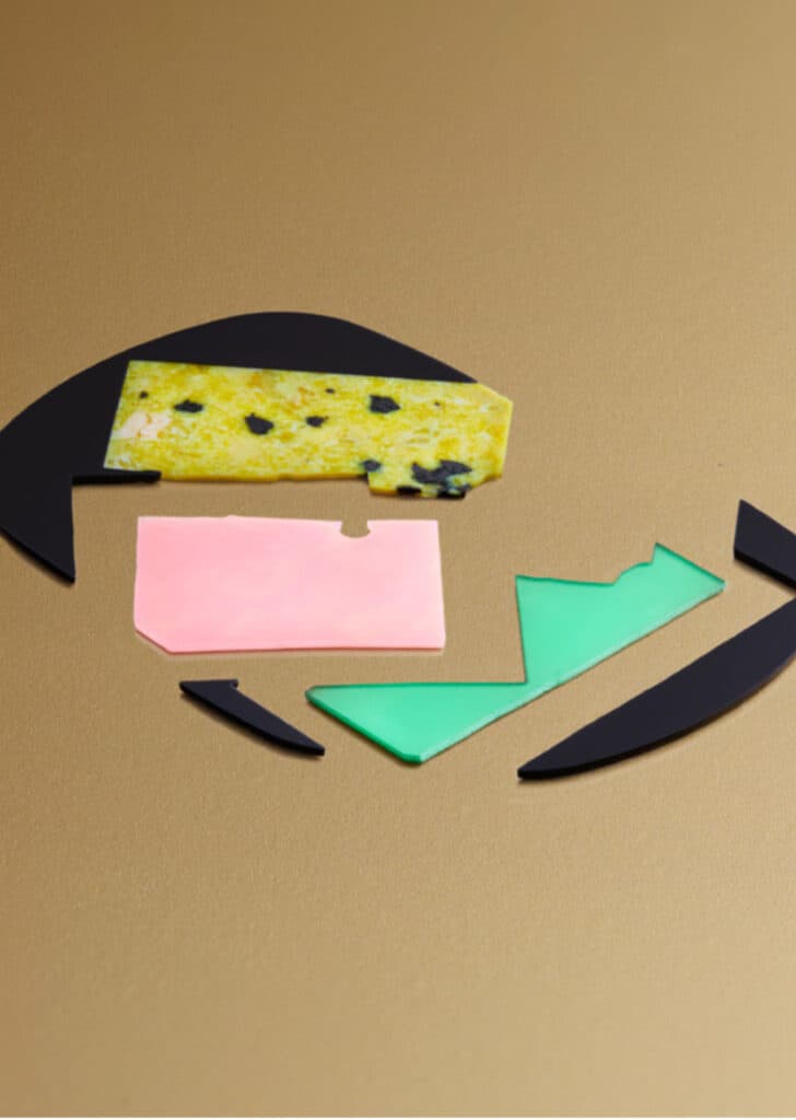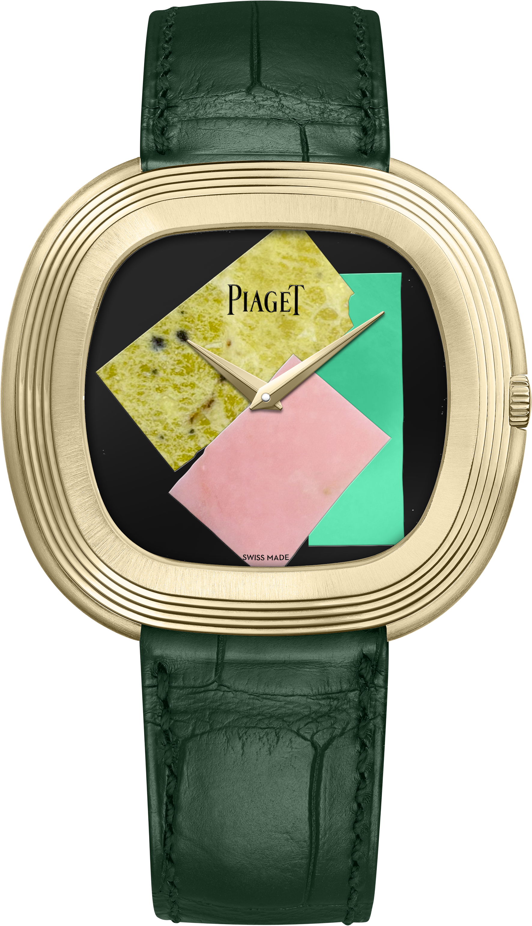 Four ornamental stones—black onyx, pink opal, green chrysoprase, and yellow serpentine—are meticulously cut and set to create a vibrant abstract composition. The stepped 45mm case, cast in 18-carat yellow gold in homage to Warhol’s own watch, enhances the striking geometry. A deep green leather strap completes the palette, chosen to accentuate rather than overpower the dial’s vivid contrasts.
