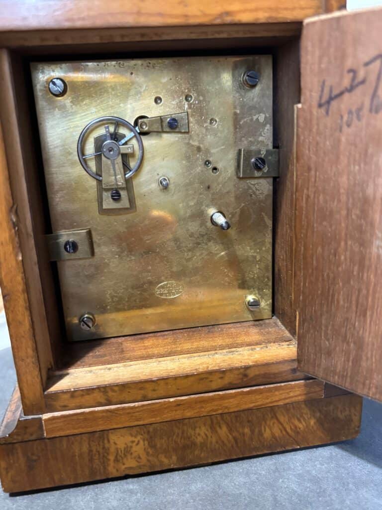 This charming 8-day antique library clock from around 1890 features a walnut case, enamel dial, and brass handle making it a stylish and vintage addition to any room.